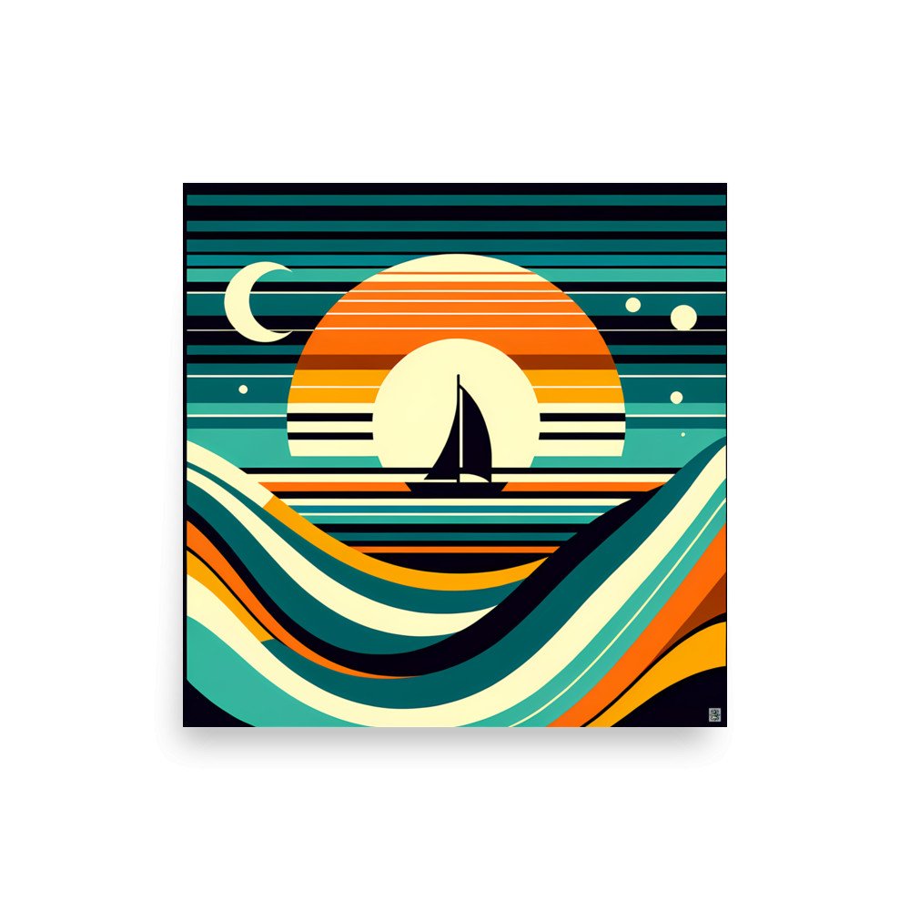 A stylised sailboat sits against a striped sunset with a crescent moon, stars and flowing layered waves. Bold teal, cream and orange bands create a geometric gradient look with a modern abstract feel. The clean lines and colour fade art influence give the scene a striking retro-futurist atmosphere.