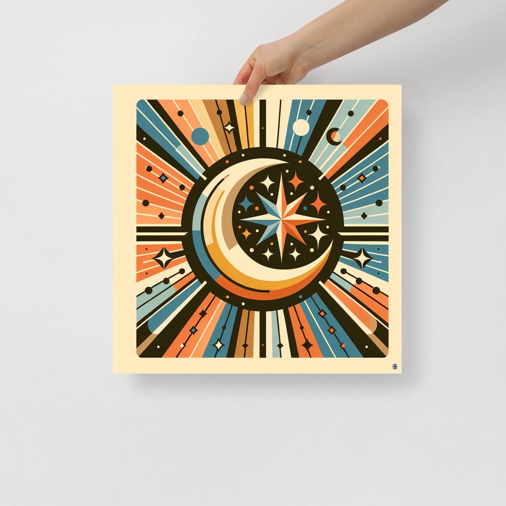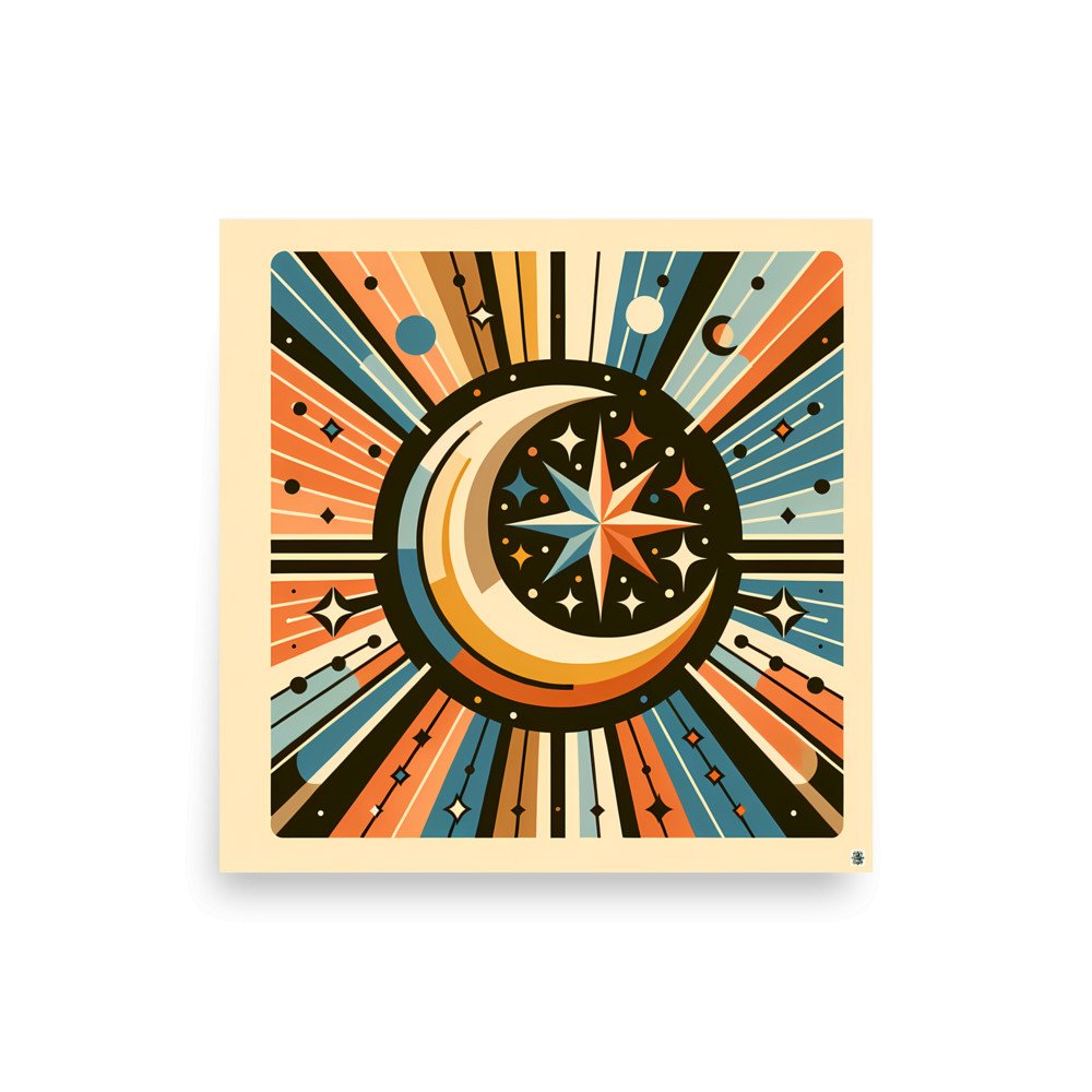 Printed on heavyweight matte paper, this poster captures every precise line of the cosmic design. The archival quality ensures the retro orange, cream, and blue palette of the balanced celestial scene remains vivid for years.