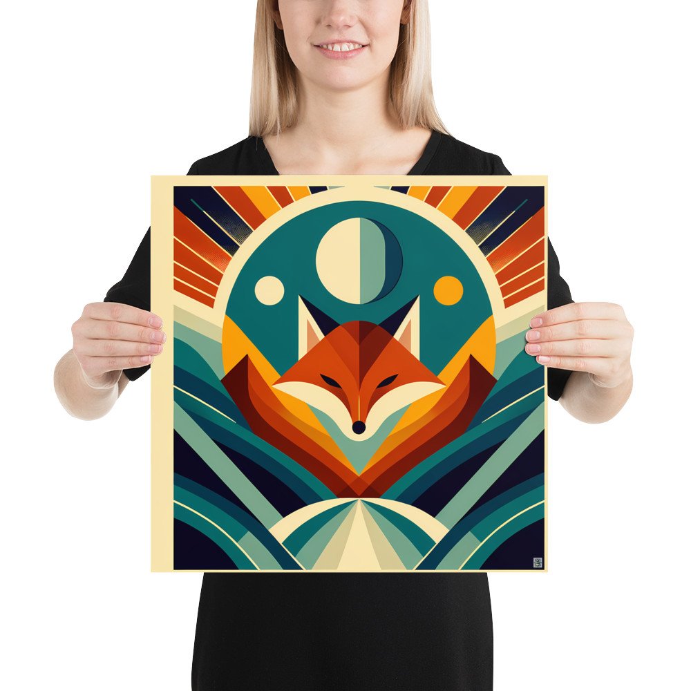 A stylised fox portrait is built from bold geometric shapes, layered arcs and radiant lines. Warm orange and cream tones contrast with deep teal and navy, creating a balanced wildlife composition beneath a moonlit sky. The symmetrical layout gives this fox design a sleek, modern feel.