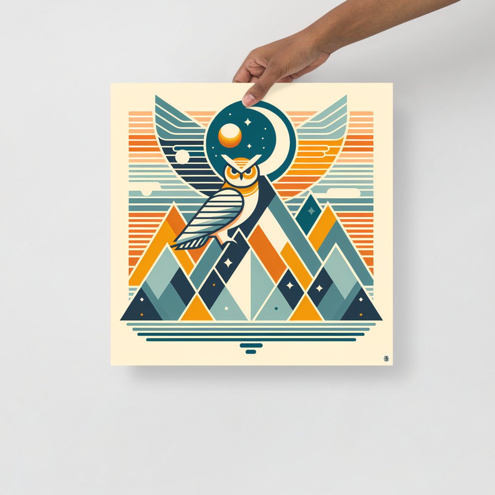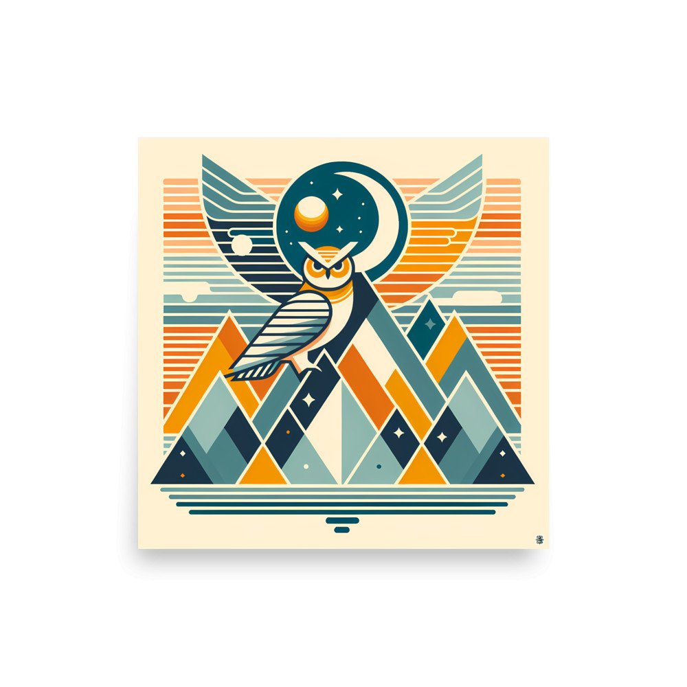 A stylised owl stands before a crescent moon and layered planets, framed by angular mountain shapes and striped retro skies. Teal, navy, orange and cream tones give this geometric wildlife illustration a bold mid-century feel. The owl silhouette and celestial details create a balanced, symmetrical composition.