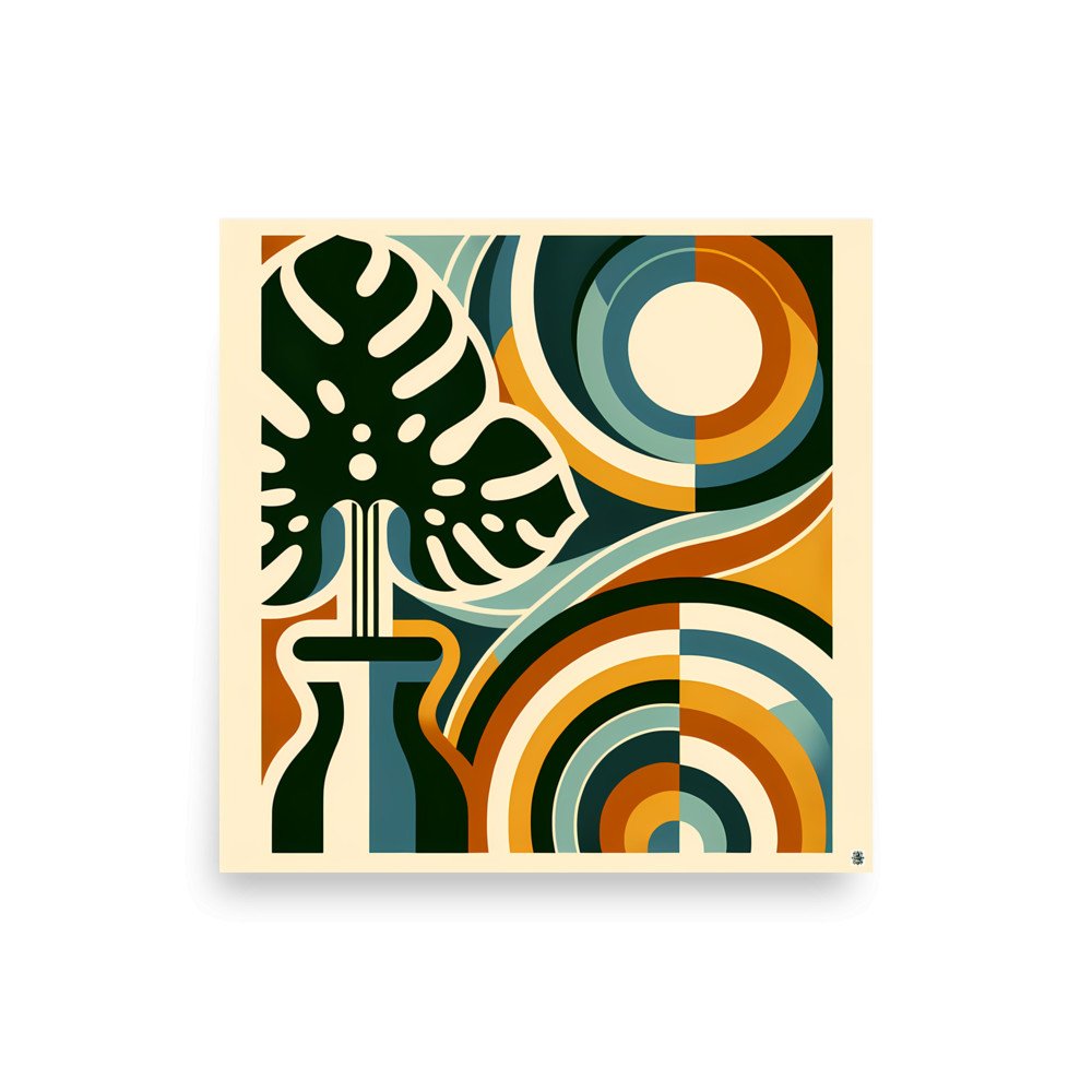 A bold abstract botanical composition featuring a stylised monstera leaf in a vase, framed by layered geometric arches and flowing organic shapes. Deep green, teal, mustard and rust tones create a modern floral look with strong retro balance. The design blends abstract botanical elements with geometric leaves for a clean, graphic finish.