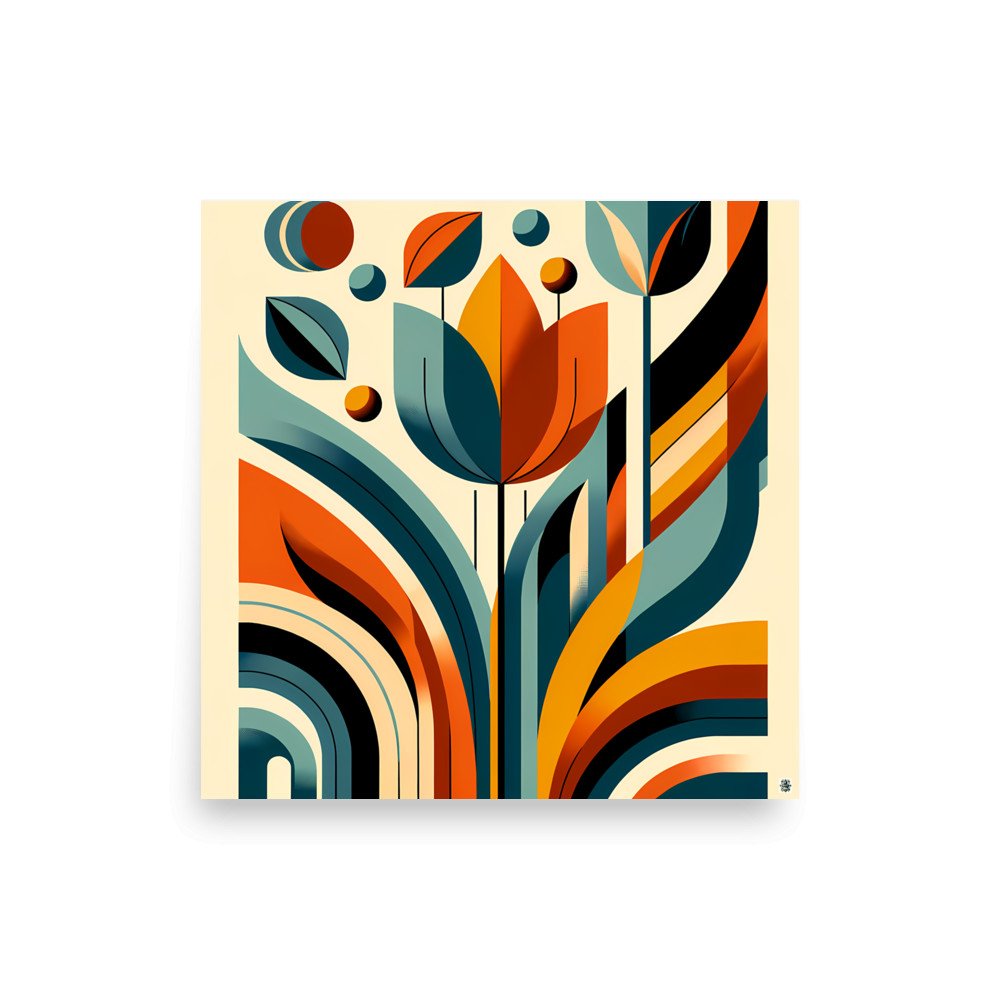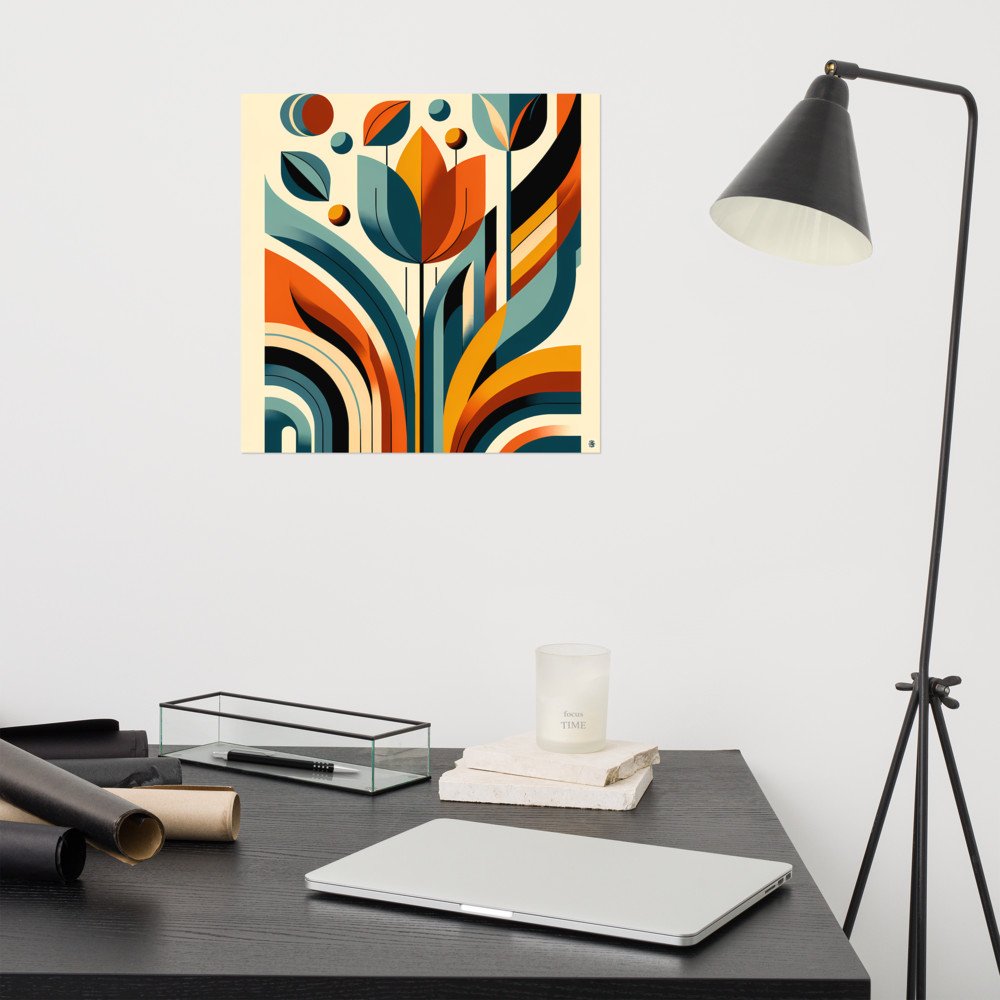 Printed on 189 g/m² archival matte paper, the teal-and-orange flower composition reads as a crisp, graphic statement. The square format (10 to 16 inches) suits a simple frame, letting the abstract arcs and ochre centre take focus. It’s a clean addition to a gallery wall or a desk nook.