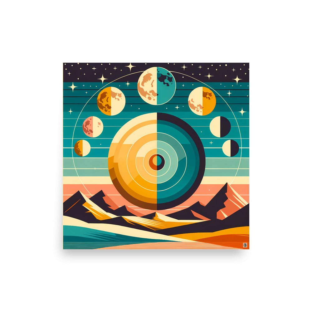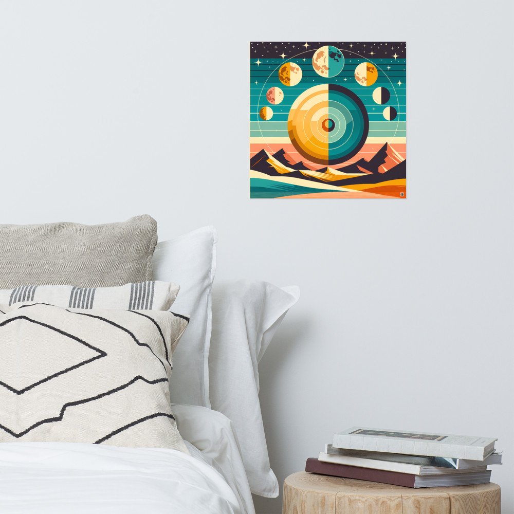 Printed on heavyweight matte paper, this poster captures the crisp detail of the graphic mountain and moon phase design. The archival quality ensures the retro-futurist colours and star-filled sky remain vivid. Its square format suits a variety of contemporary frames.