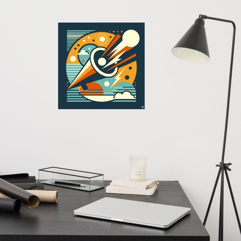 Printed on heavyweight matte paper, this archival poster captures the design's crisp lines and bold typographic energy. The contrast of orange and teal within the planetary composition suits a minimalist display.