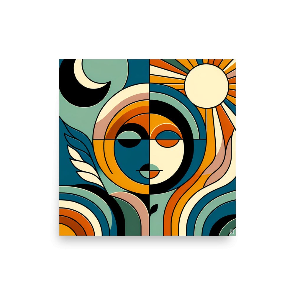 A stylised portrait combines sun rays, a crescent moon and flowing geometric bands in a bold retro palette. The symmetrical composition blends abstract portrait line influences with modern minimal shapes, using teal, orange, cream and black for strong contrast.