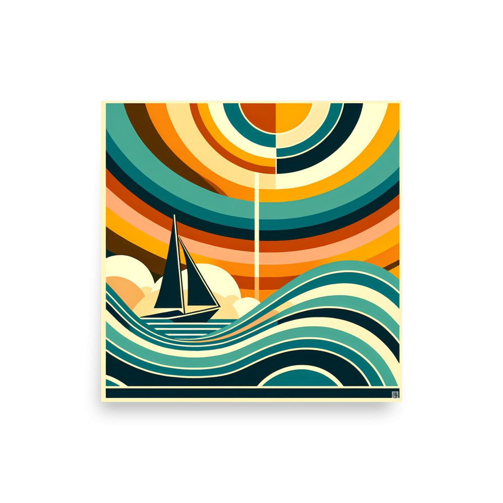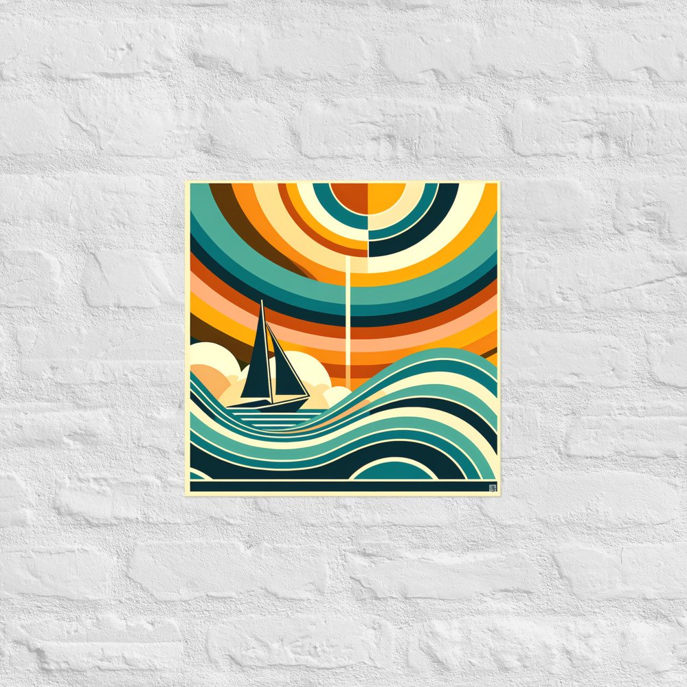 Printed on substantial matte archival paper, this poster captures the sharp graphic contrasts of the composition. The stylised sailboat and sun, defined by teal and amber planes, lend a clean, contemporary air to any space.
