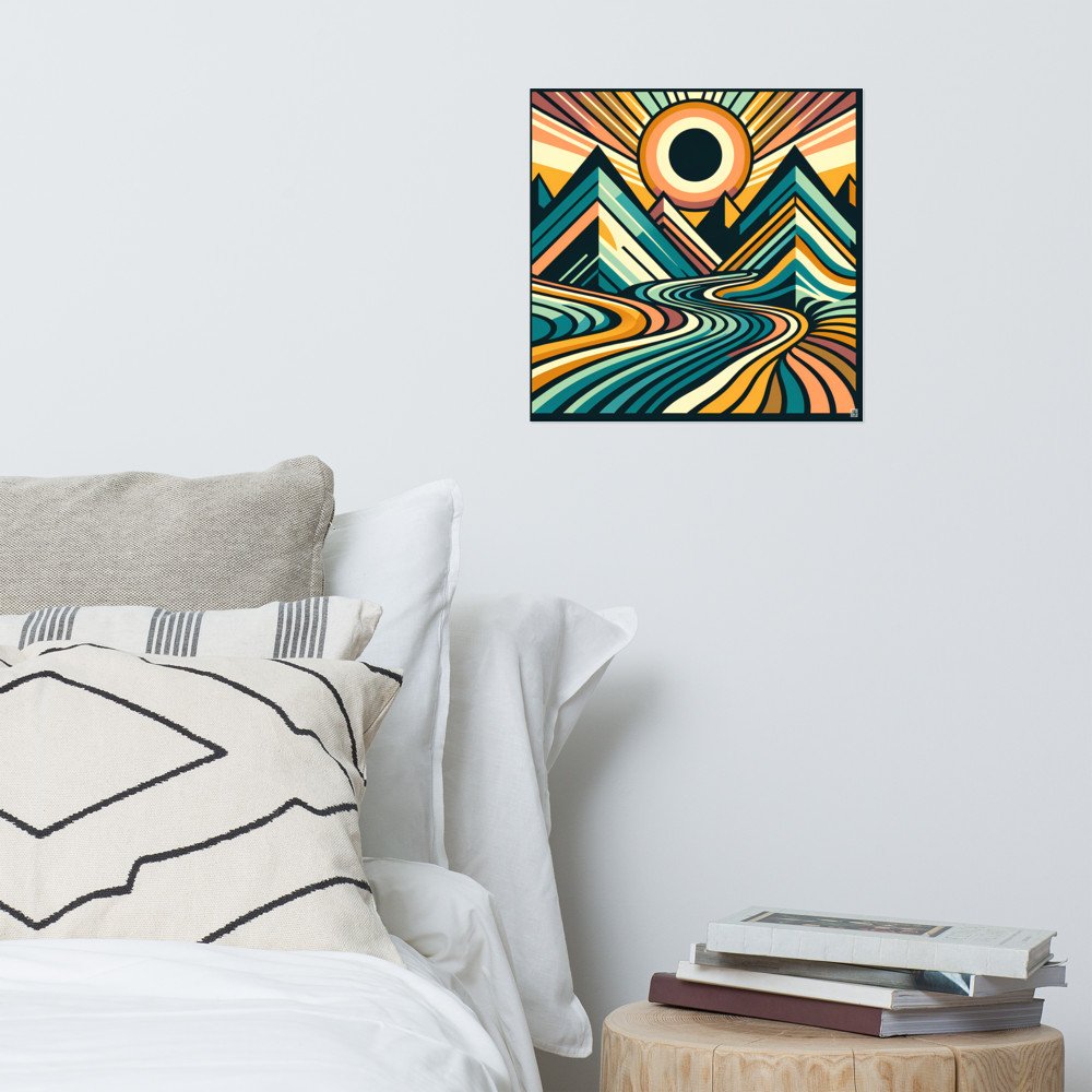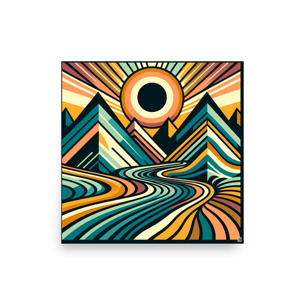 Archival matte paper captures the crisp symmetry of this geometric mountain sunrise, from the flowing striped terrain to the warm coral sunburst. The square format suits a gallery wall or a reading nook, where the teal and amber forms hold their own without competing. A clean, printed meditation on landscape.