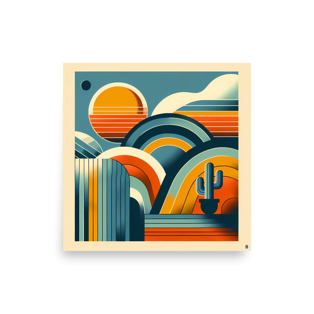 Saffron MesaDesert Arches and Striped Sun Illustration — Poster