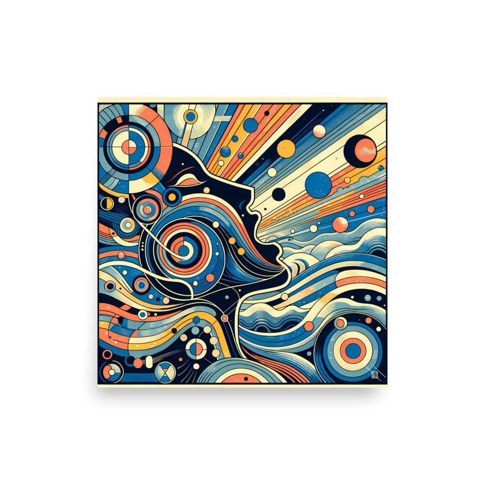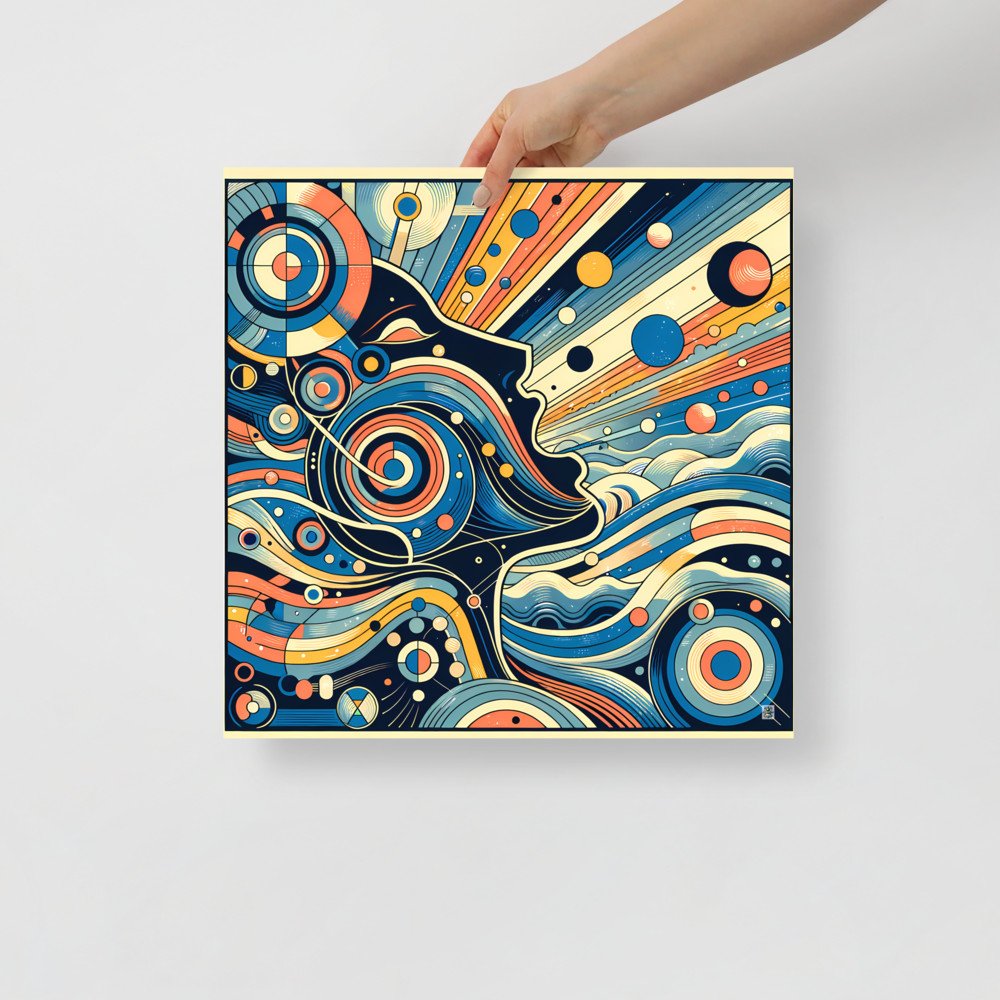 Printed on substantial matte archival paper, this square poster captures every detail of the flowing, wave-like lines. The bold geometric circles and cosmic profile offer a lasting piece of graphic art for your space.