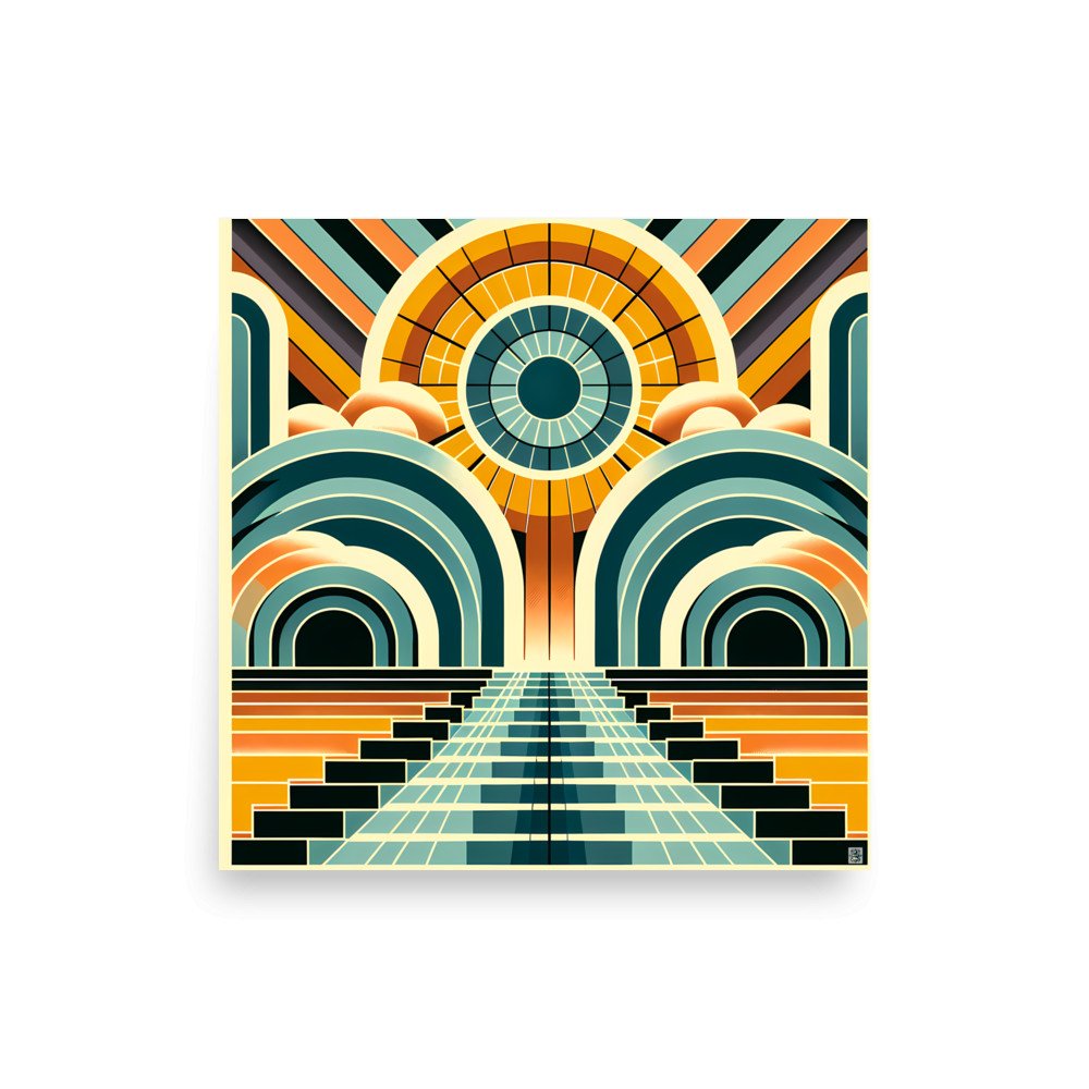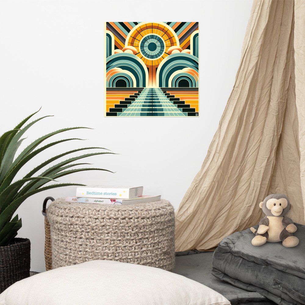 Printed on heavyweight matte paper, this poster captures every sharp detail of the geometric sunburst and stairway. The archival quality ensures the teal and amber hues remain vibrant, perfect for those who appreciate precise, graphic art.
