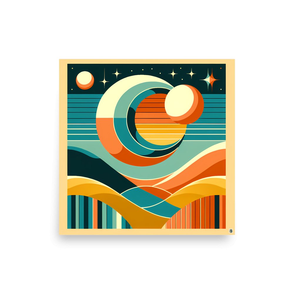 Geometric Sun and Moon Over Abstract Desert — Poster
