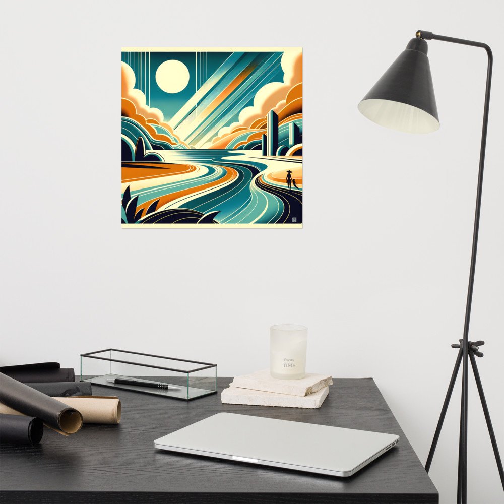 Printed on substantial matte paper, this poster captures the crisp detail of the geometric sun and distant cliffs. The archival quality ensures the teal and burnt orange palette of this stylised coast remains vibrant for years.