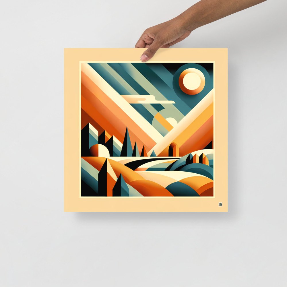 Printed on heavyweight matte paper, this art poster captures the crisp detail of the retro landscape. Its archival quality ensures the clean shapes and textured shading in teal and orange remain vivid, perfect for simple, stylish framing.