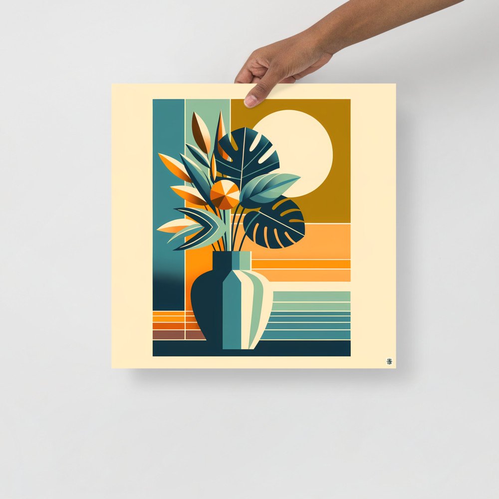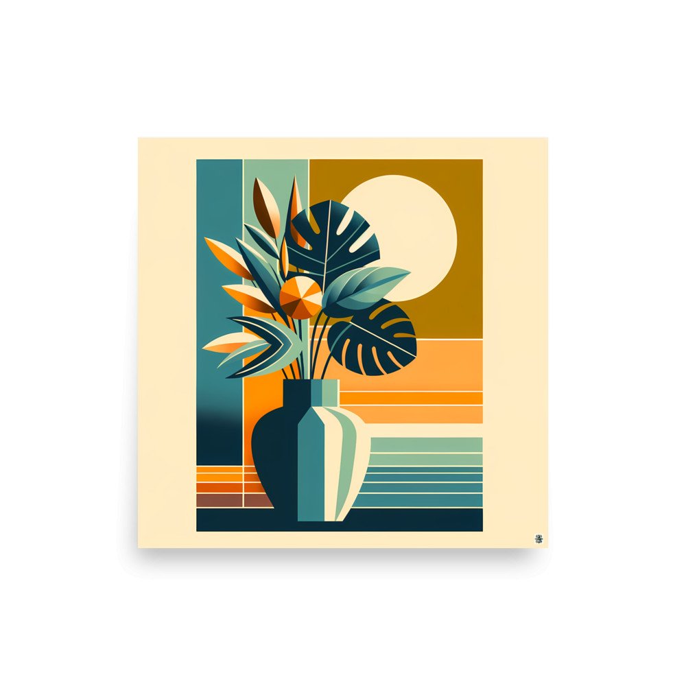 Printed on substantial archival paper, this poster captures the precise detail of the geometric botanical scene. The interplay of teal and ochre blocks creates a warm, mid-century focal point ideal for a study or hallway.