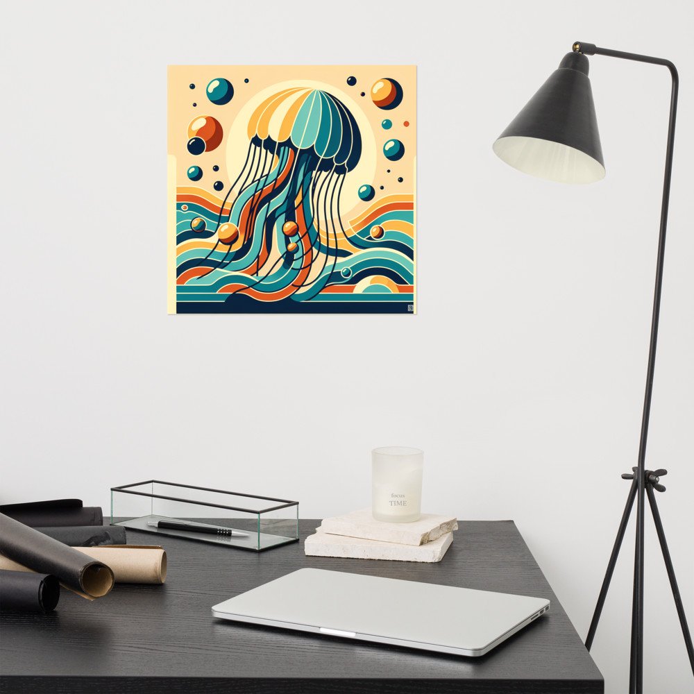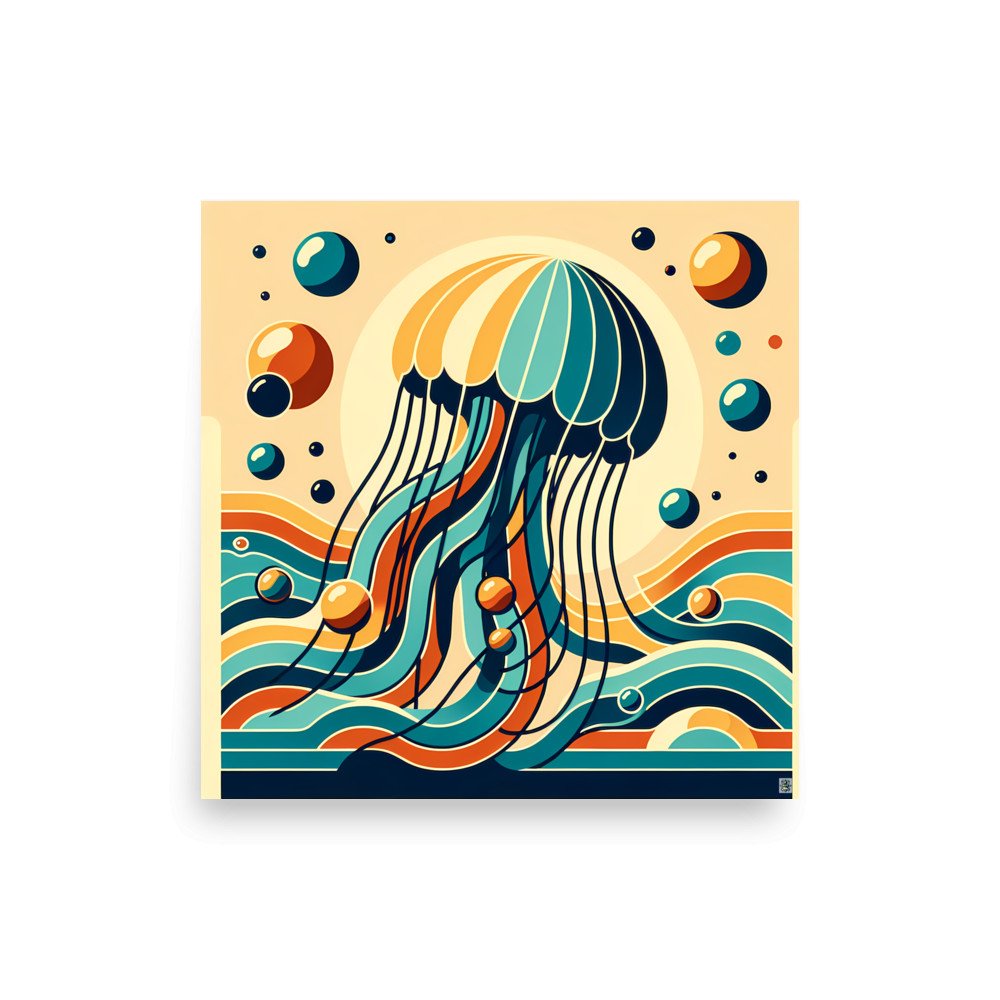 Coral TideRetro jellyfish over stylised ocean waves — Poster
