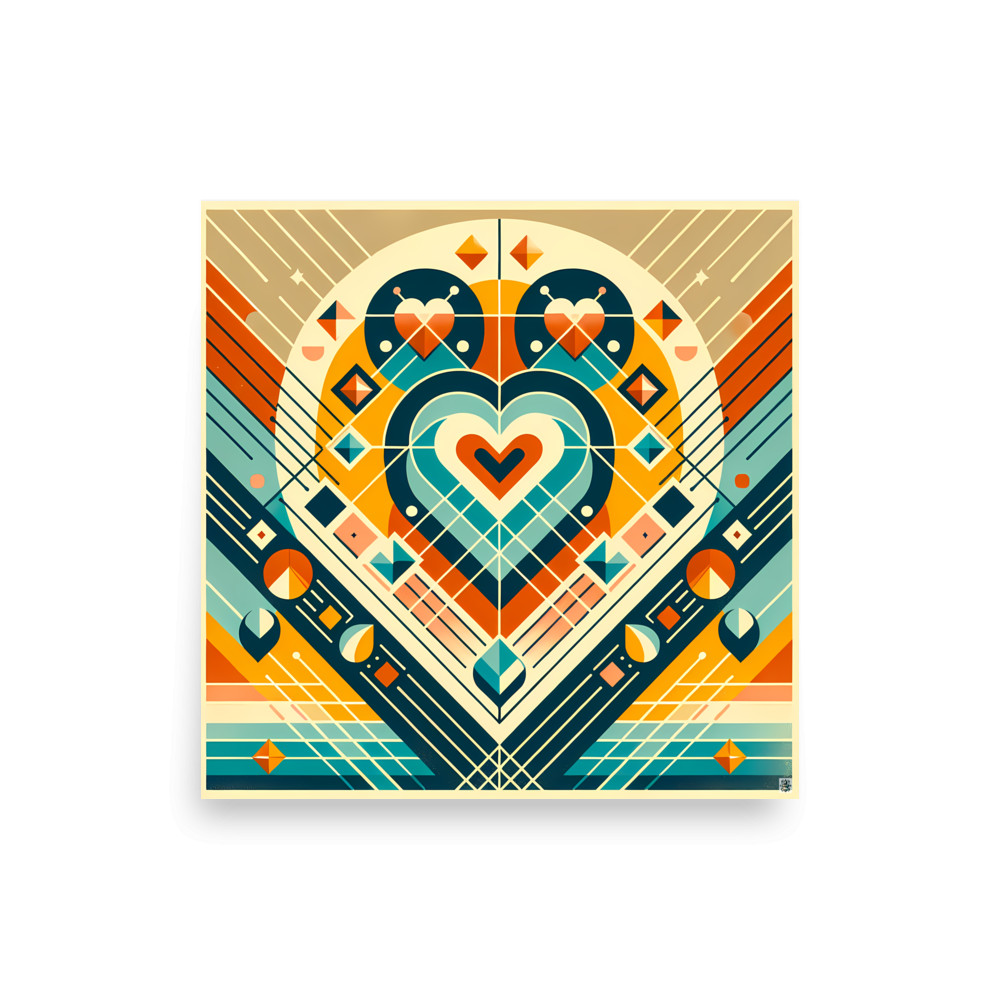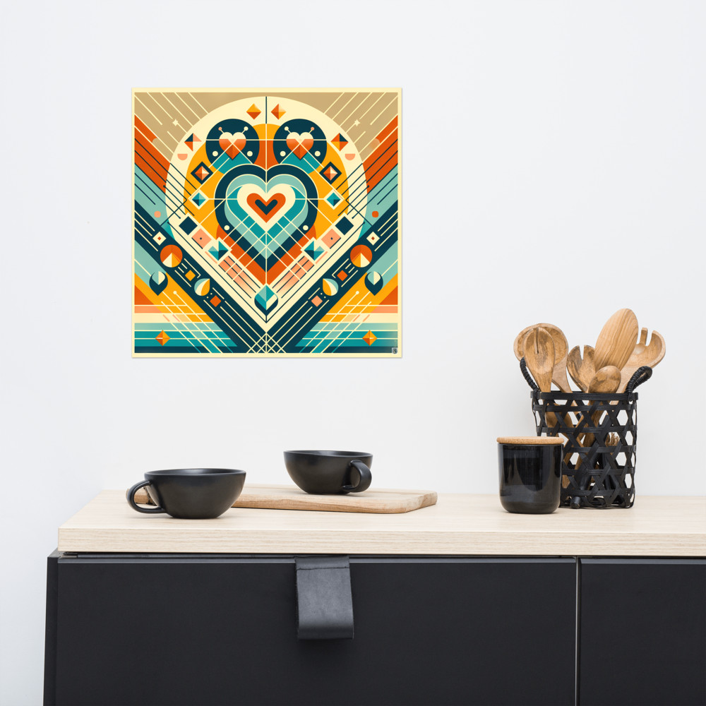 Printed on 189 g/m² archival matte paper, the square poster captures every crisp line and angular shape within the heart motif. Teal, navy, and amber remain true to the original, while the enhanced matte finish reduces glare for a clean gallery look. Available in 10 to 16 inches, it fits easily into a simple frame or clip display.