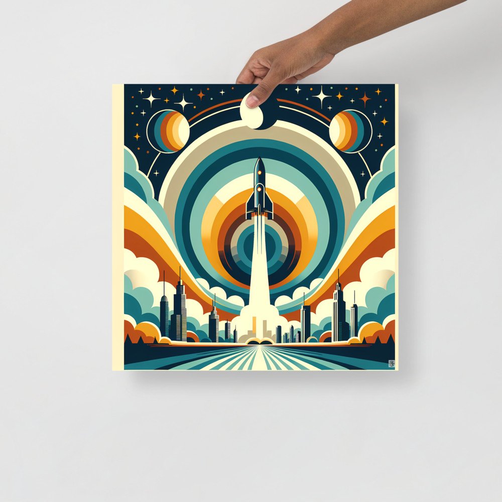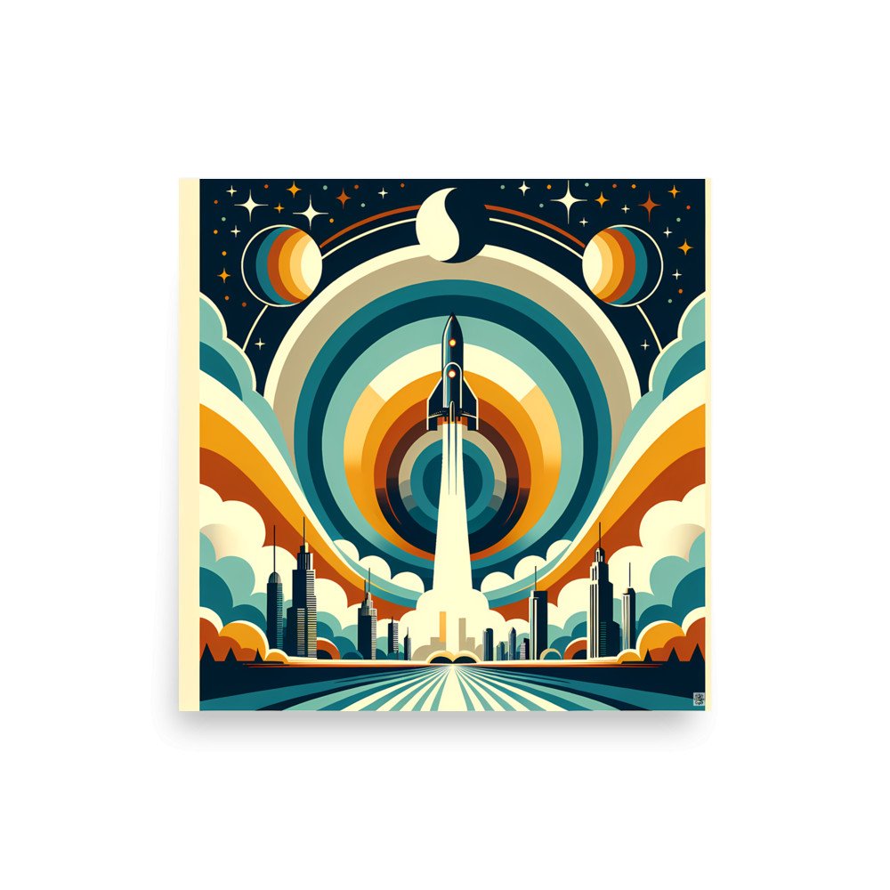 Orbit EmberRetro Rocket Launch Over Geometric City Skyline — Poster