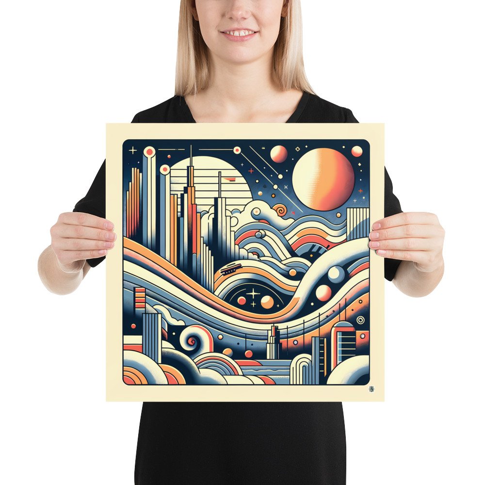 Printed on substantial matte paper, this piece presents the abstract space scene with archival quality. The crisp lines of the futuristic architecture and soft coral planets are captured with clarity for a refined display.