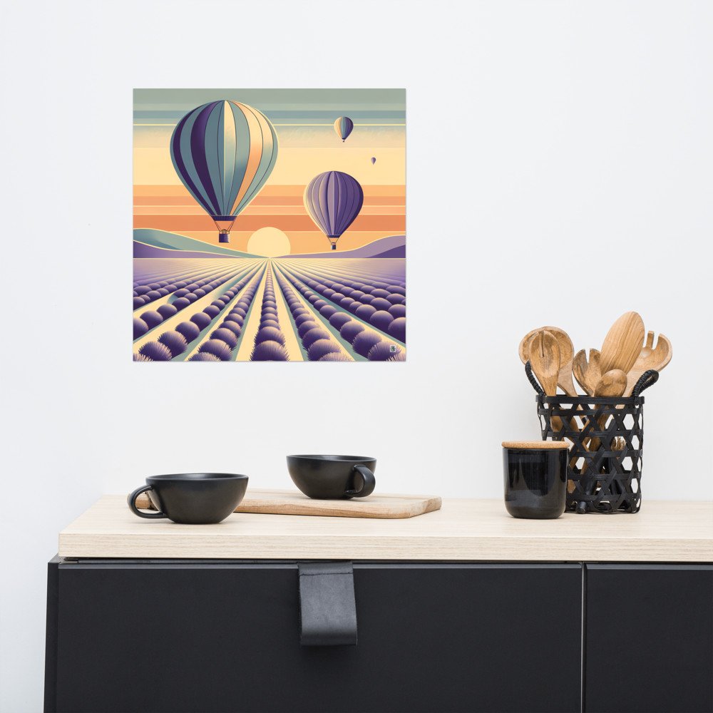 Aerial DriftRetro Hot Air Balloons Over Lavender Fields at Sunset — Poster