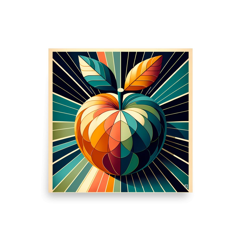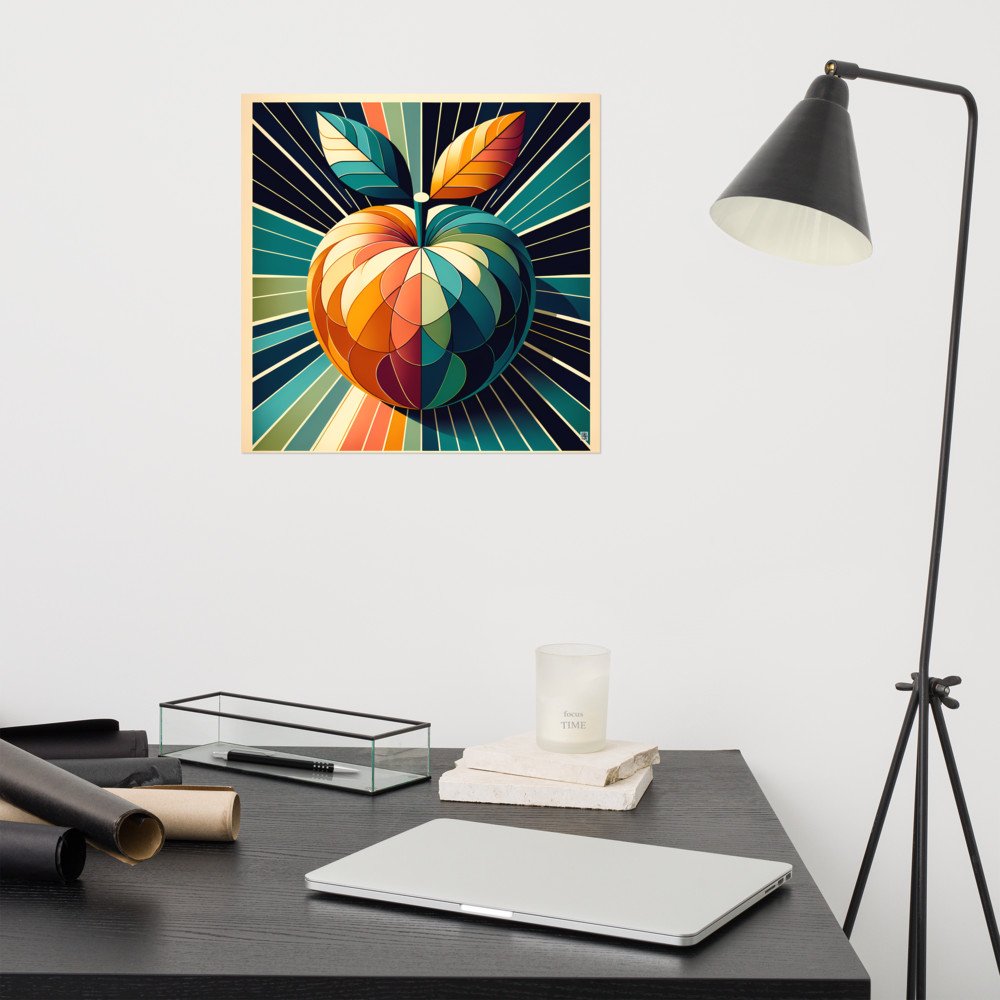 Printed on substantial matte archival paper, this art poster captures every detail of the layered geometric design. The stylised apple in its teal and orange sunburst makes for a refined, gallery-style presentation.