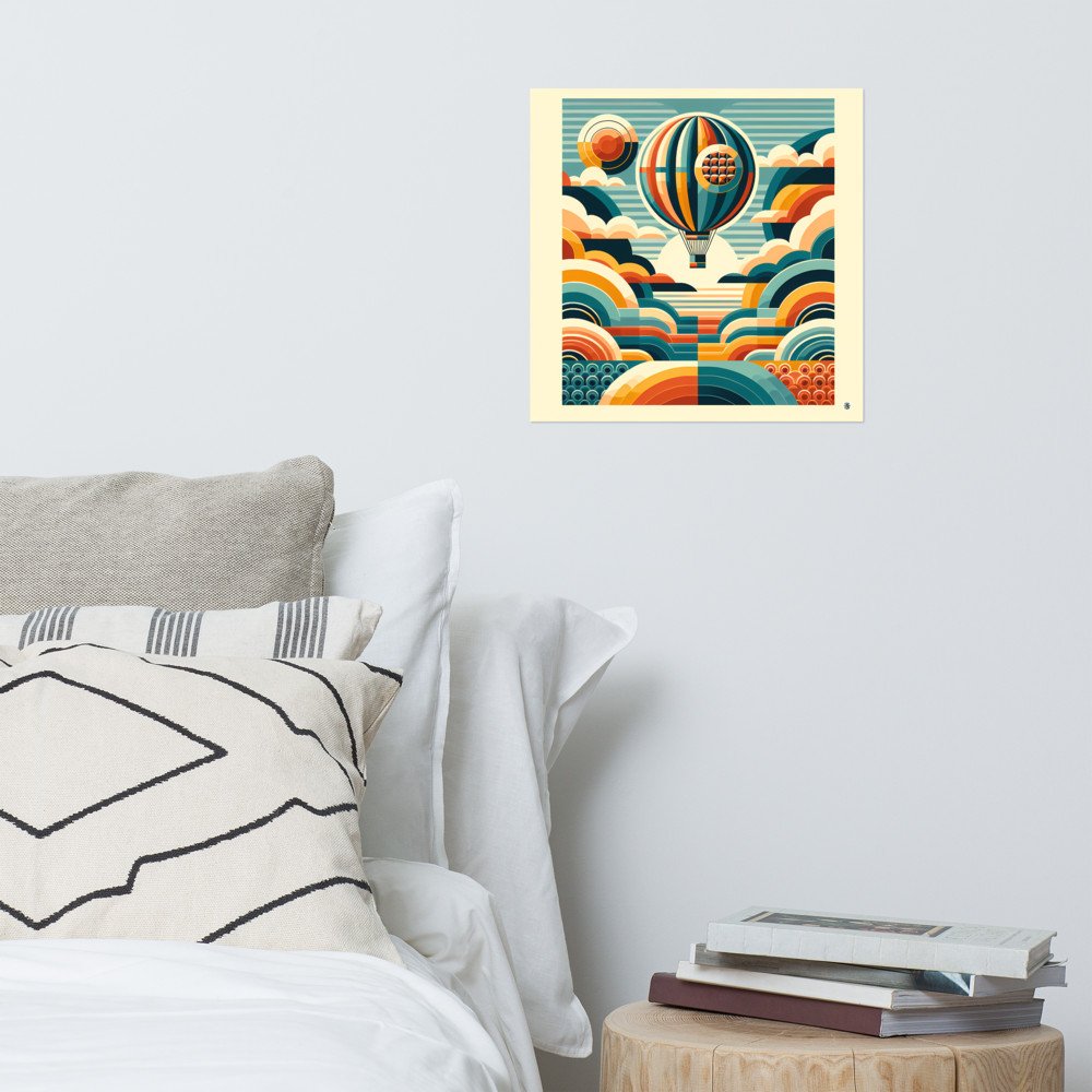 This design's got a really cool retro vibe with its hot air balloon floating among geometric clouds. The way the orange, teal, and yellow colours mix gives it a warm, nostalgic feel. It's like looking at a piece of art from a different era.
