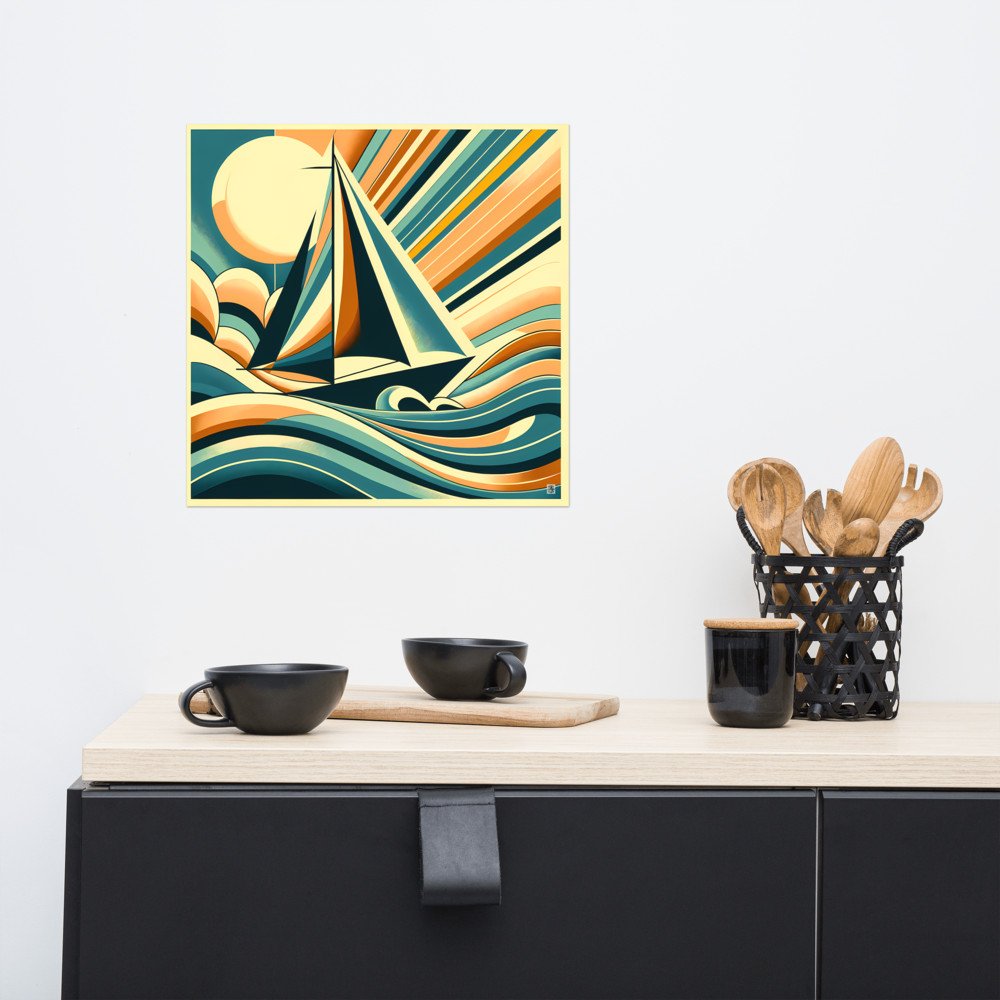 Retro sailboat art featuring bold geometric waves in teal, orange, and yellow hues. Mid-century modern style with a vintage travel poster vibe, showcasing abstract sun and dynamic lines. Perfect for lovers of nautical themes and vibrant colour palettes.