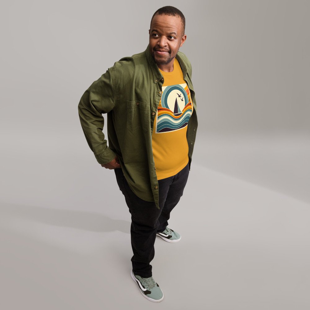 This relaxed-fit cotton tee carries the serene geometry of a sailboat at sunset. Its clean, curved bands in teal, beige and orange offer a subtle nod to retro style, perfect for everyday wear. The soft ringspun fabric ensures the design remains a comfortable, understated feature.