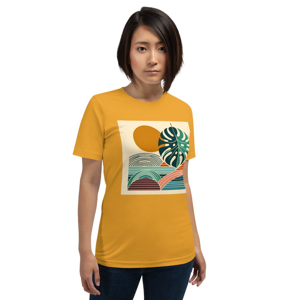 Verdant ReverieAbstract Monstera Leaf with Sun and Geometric Waves — T-Shirt