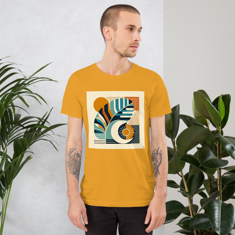 The abstract botanical design, with its teal, navy and burnt orange palette, brings a modern mid-century feel to this relaxed cotton tee. Its soft ringspun fabric ensures the stylised leaf and celestial motifs remain comfortable and crisp throughout the day.