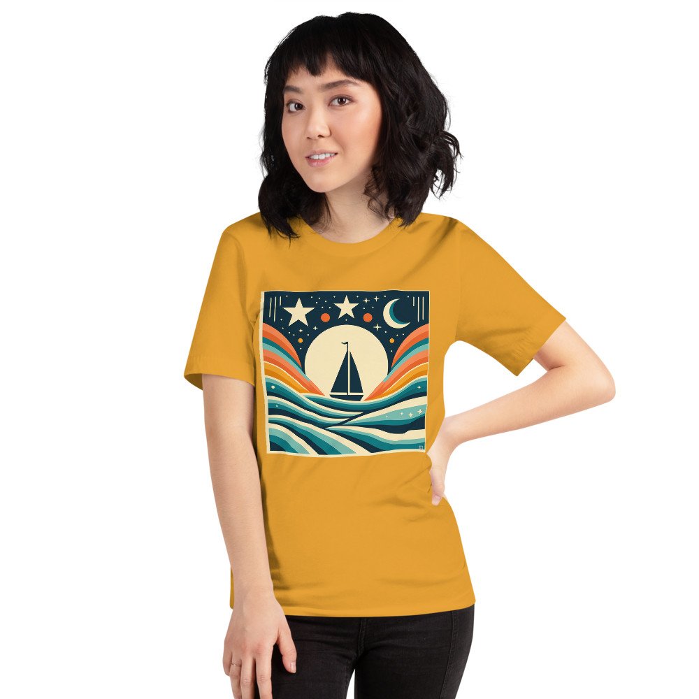 A stylised sailboat silhouette glides across layered, flowing waves beneath a starry night sky with a crescent moon. Bold geometric shapes and a soft gradient colour fade create a modern abstract art feel. The palette blends teal, navy, cream, and warm orange in a clean, poster-like composition.