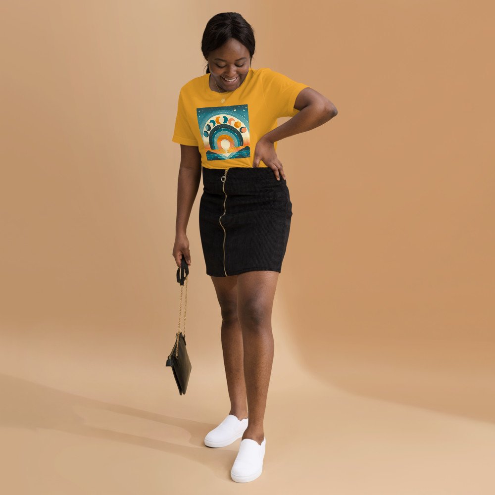This relaxed-fit tee in ringspun cotton carries the celestial geometry with comfort. Crisp line work depicting moon phases and a radiant sun sits against a balanced palette of teal and warm orange, offering a subtle mid-century feel to everyday wear.