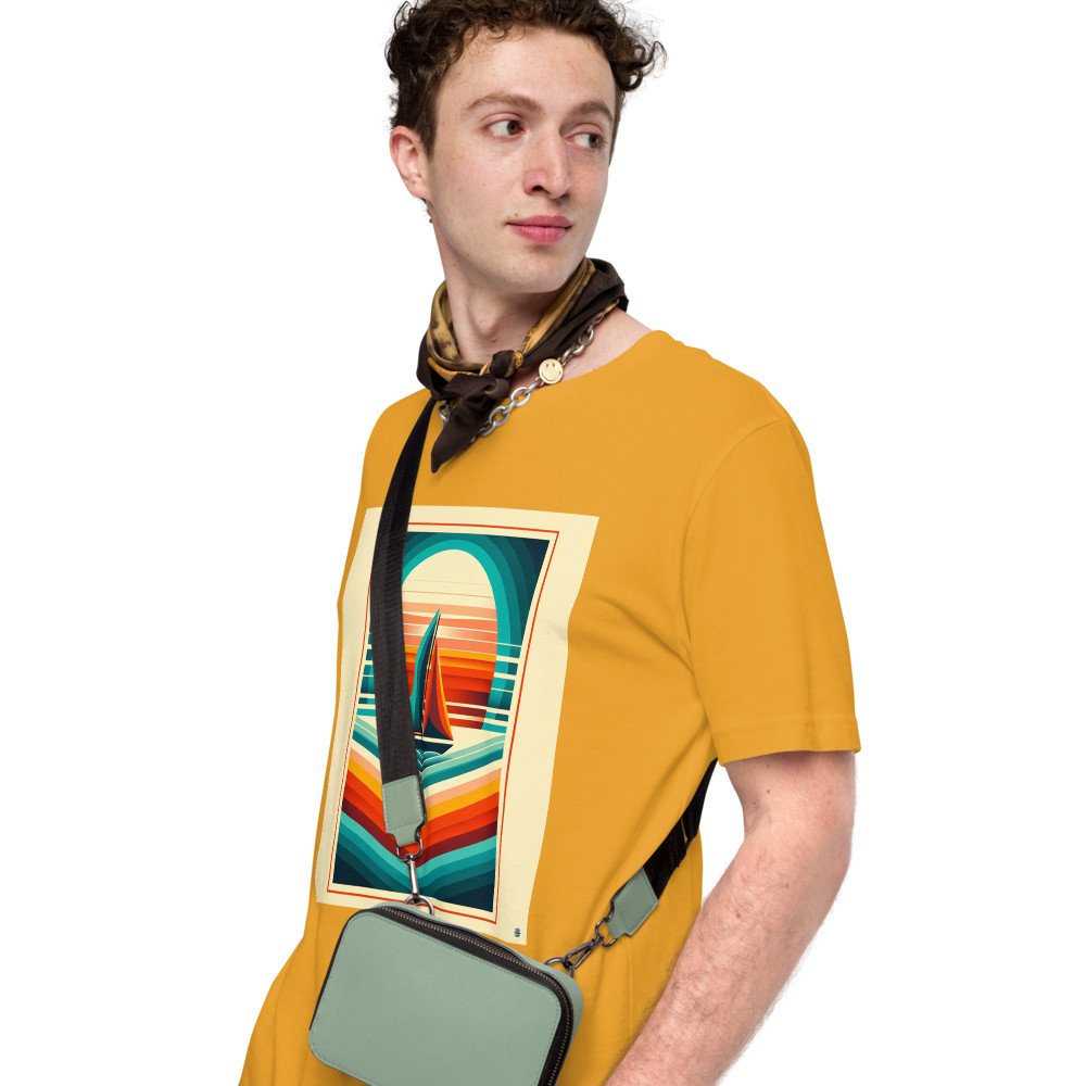 The relaxed fit of this premium cotton tee offers a comfortable canvas for the graphic sailboat scene. Its crisp geometric shapes and retro teal-to-coral gradients bring a modern, abstract feel to casual wear.