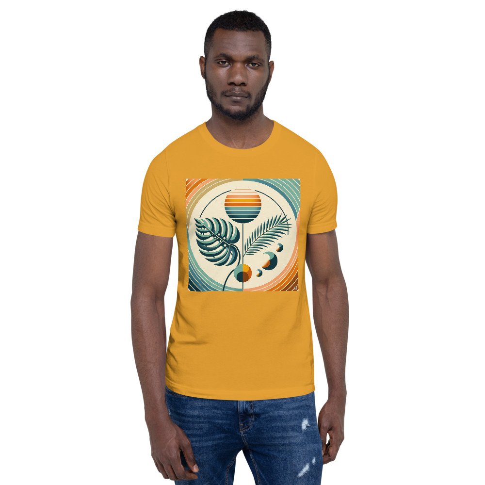 The relaxed fit of this premium cotton tee provides an ideal canvas for the graphic botanical design. Its warm peach and teal tones, depicting layered leaves and a striped sun, offer a clean, retro-modern look for everyday wear.