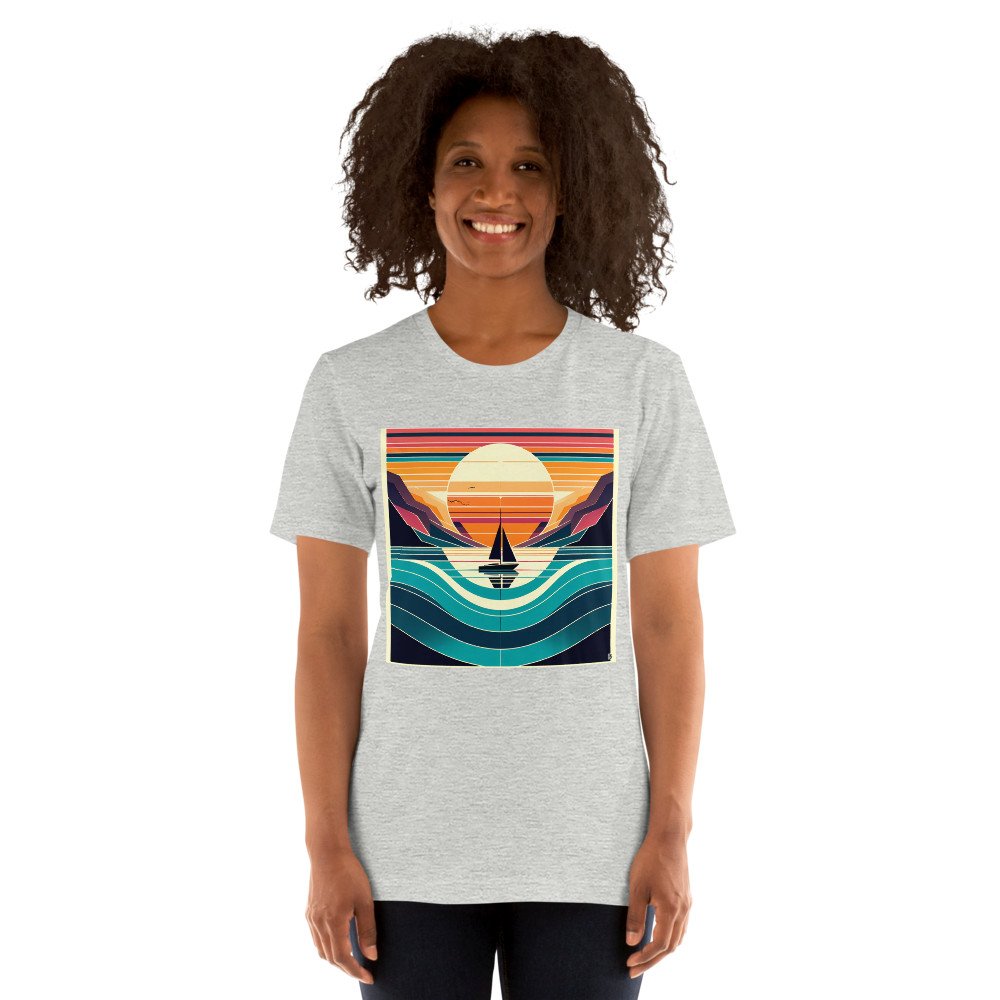 The relaxed fit of this premium cotton tee offers a comfortable canvas for the graphic sailboat scene. Its geometric gradient of warm coral and deep teal brings a crisp, modern look to casual wear, with the design's clean symmetry retained in the soft fabric.