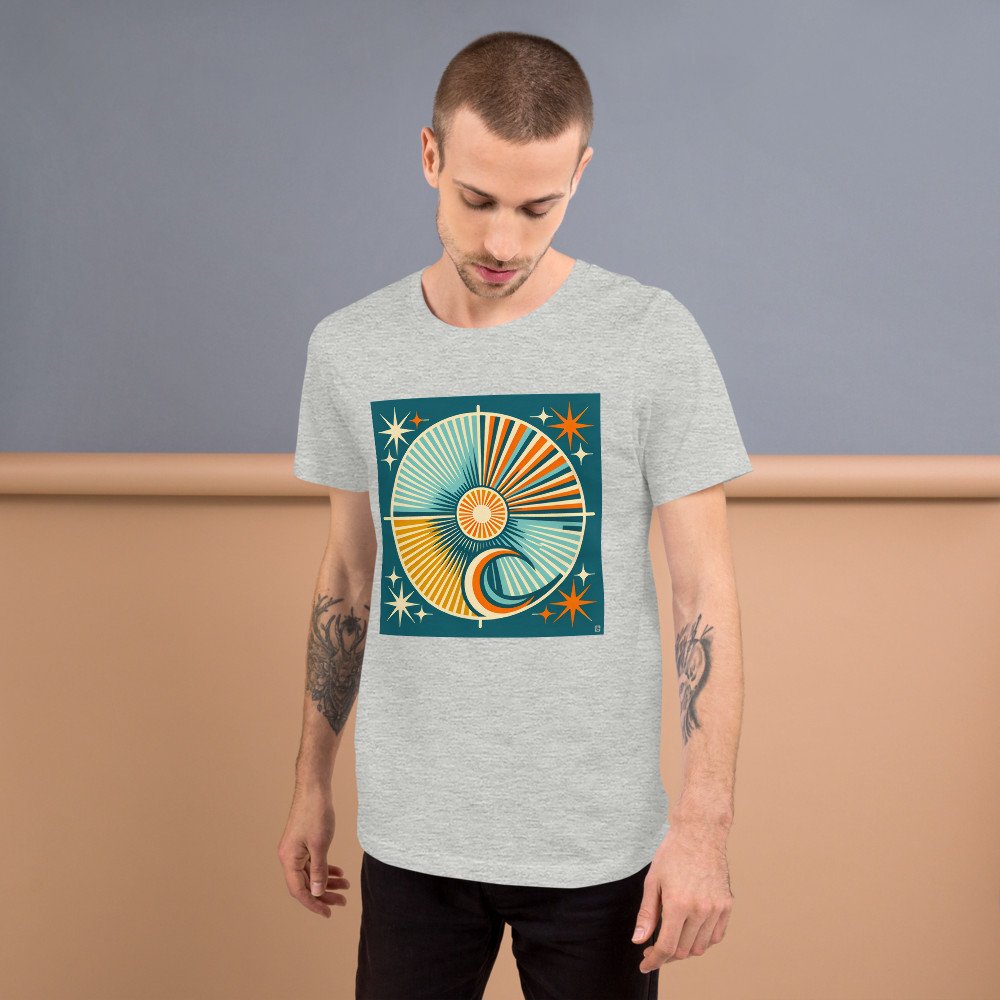 This relaxed-fit tee in premium ringspun cotton carries the celestial geometry with ease. The bold sunburst and crescent moon in teal, cream and orange create a crisp, retro graphic that feels both contemporary and timeless.