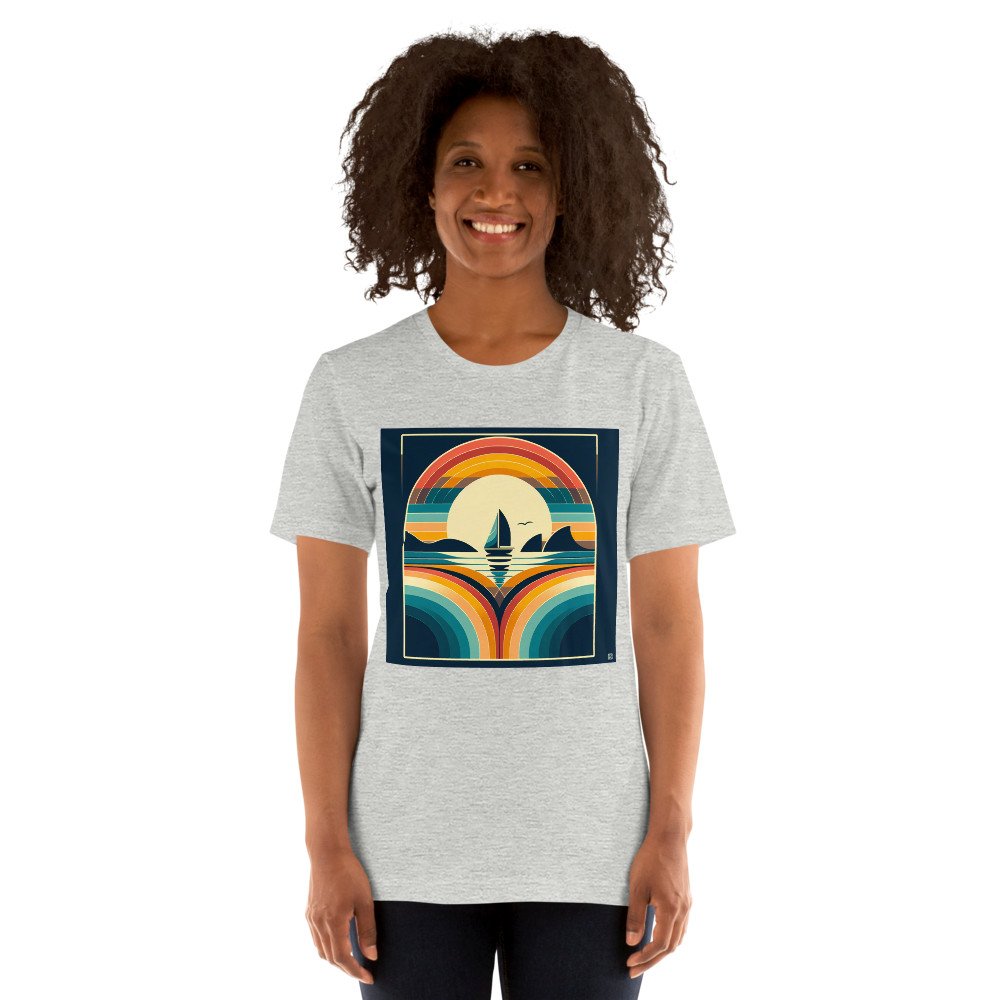 A stylised sailboat glides across calm water beneath a large sun, framed by layered arches and bold coastal silhouettes. The composition uses geometric colorblock shapes and a modern colour palette in teal, orange, cream and coral. Clean symmetry and abstract blocks give the scene a retro-inspired graphic feel.