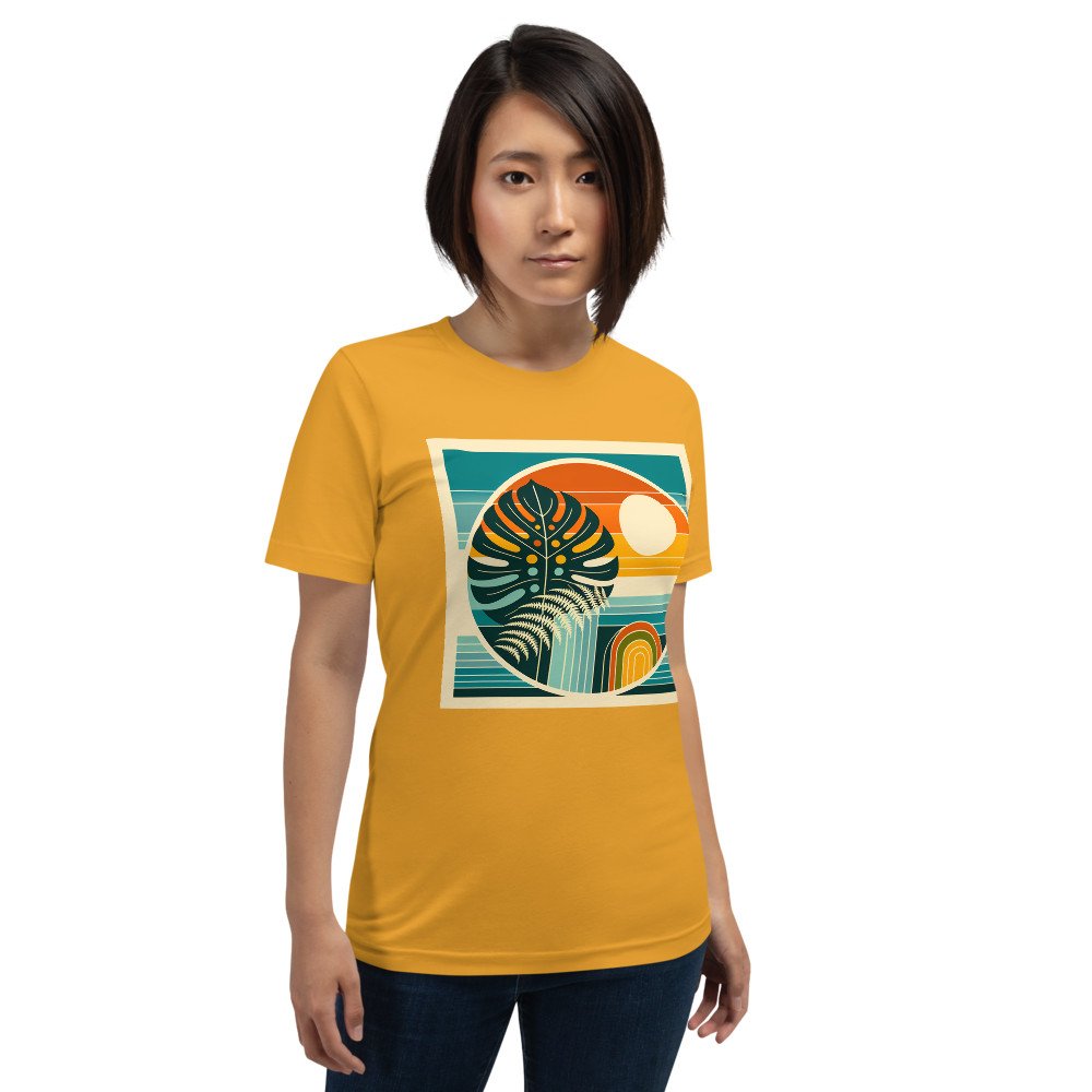 A bold abstract botanical composition featuring a stylised monstera leaf, delicate fern fronds, a glowing sun and layered geometric bands. Warm orange and cream tones contrast with teal and sage for a modern retro palette. The design blends abstract botanical shapes with minimal leaves and clean geometric structure.