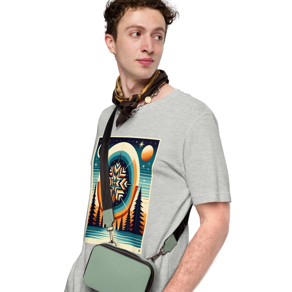 Frosted AscentGeometric Snowflake Over Winter Forest Lake — T-Shirt