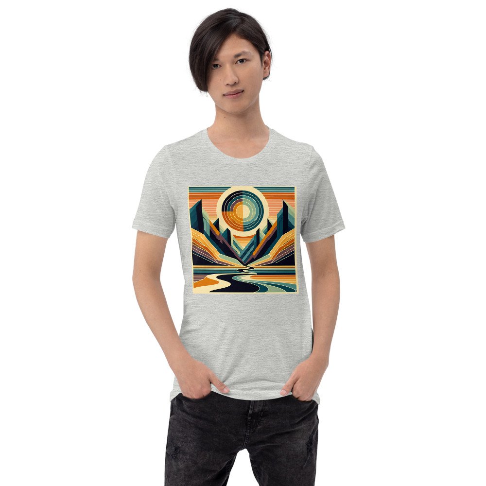 Geometric Sun Over Mountain Valley — T-Shirt