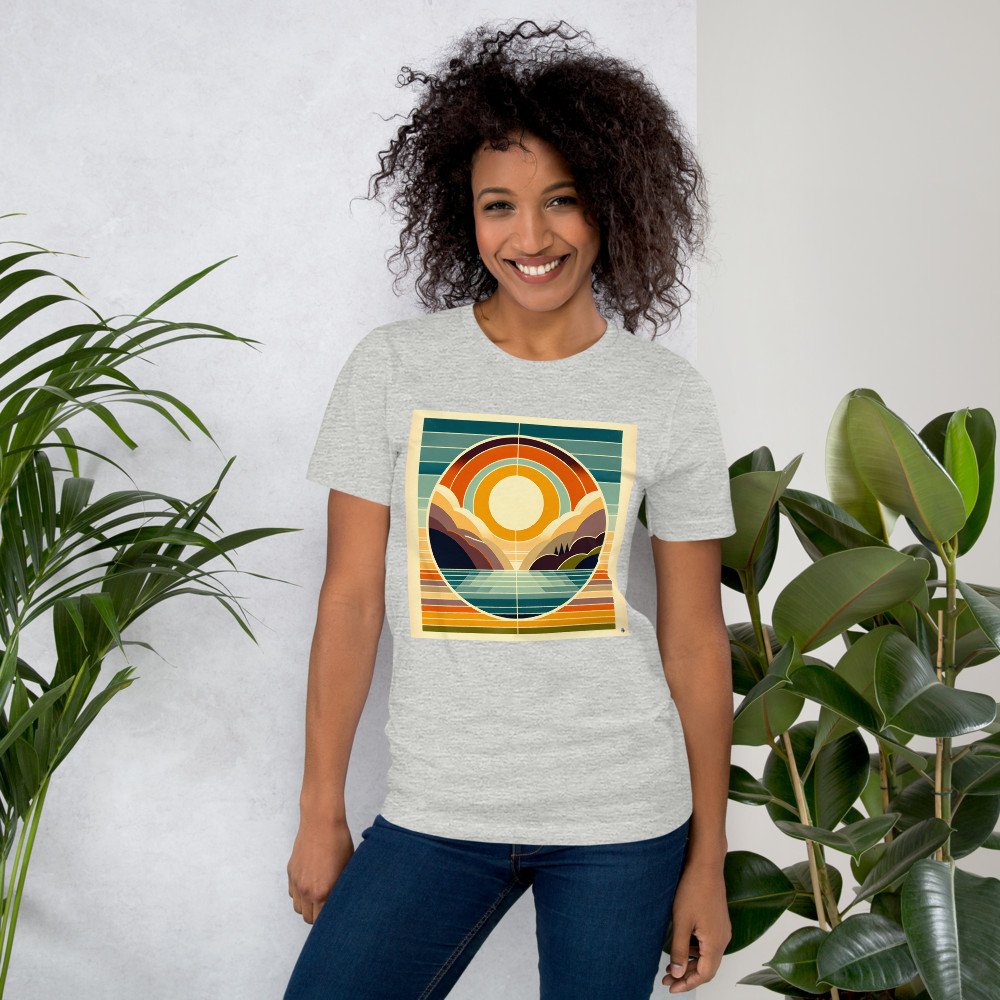 A stylised landscape of a glowing sun, layered mountains and a calm lake framed by bold geometric bands. Warm orange and beige tones contrast with teal and muted earth shades for a scandi minimalist look. The clean symmetry and neutral abstract feel echo scandinavian design with a retro-inspired finish.