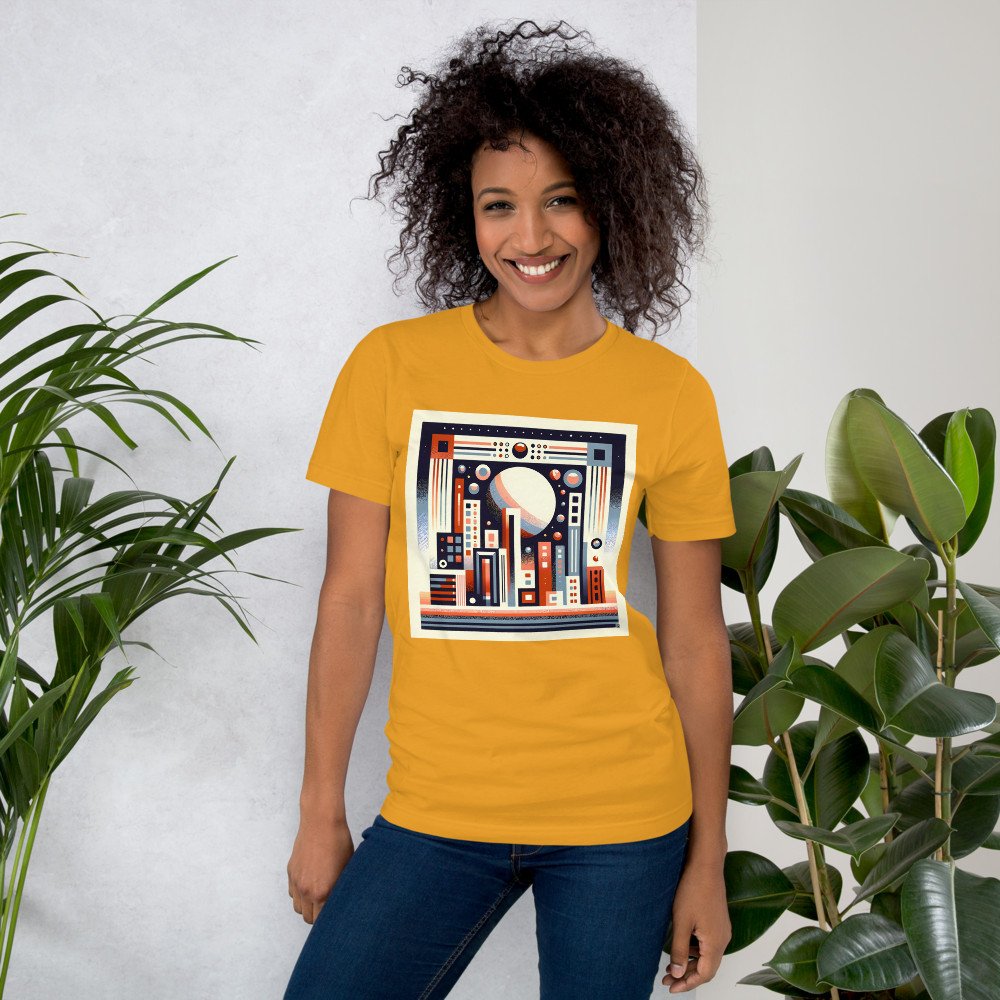 Lunar MetropolisRetro Geometric Space Cityscape with Giant Planet — T-Shirt
