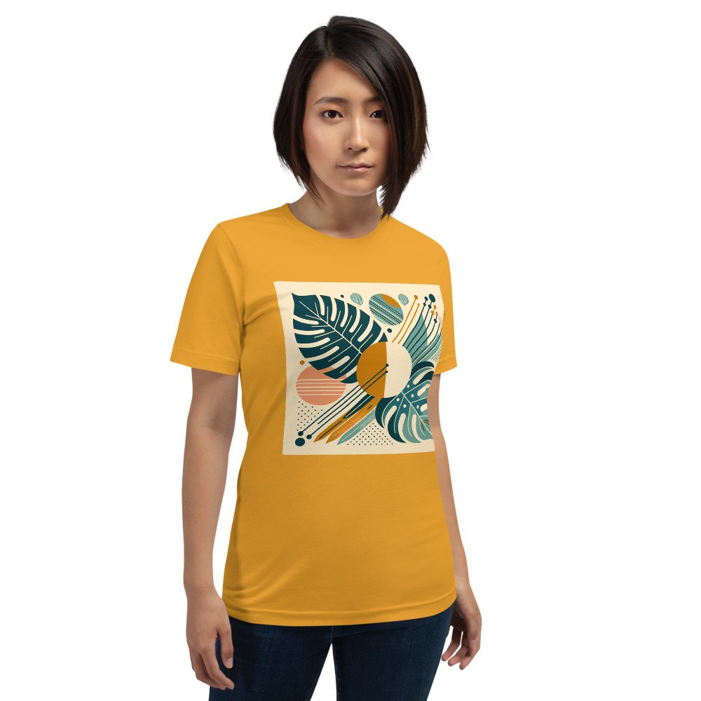 An abstract botanical composition featuring bold monstera leaves, striped circles and diagonal linework in teal, mustard and peach. The layered shapes create a modern floral rhythm with a clean geometric leaves aesthetic. Soft texture and balanced symmetry give the design a refined mid-century feel.