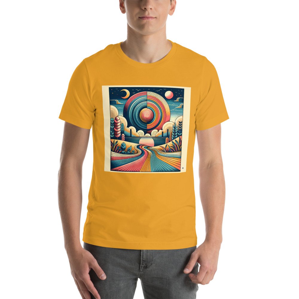 This relaxed-fit cotton tee carries the retro landscape, where vibrant bands of teal and coral form an abstract road. The design's clean, geometric shapes and spiral sun suit the soft, breathable fabric for everyday wear.