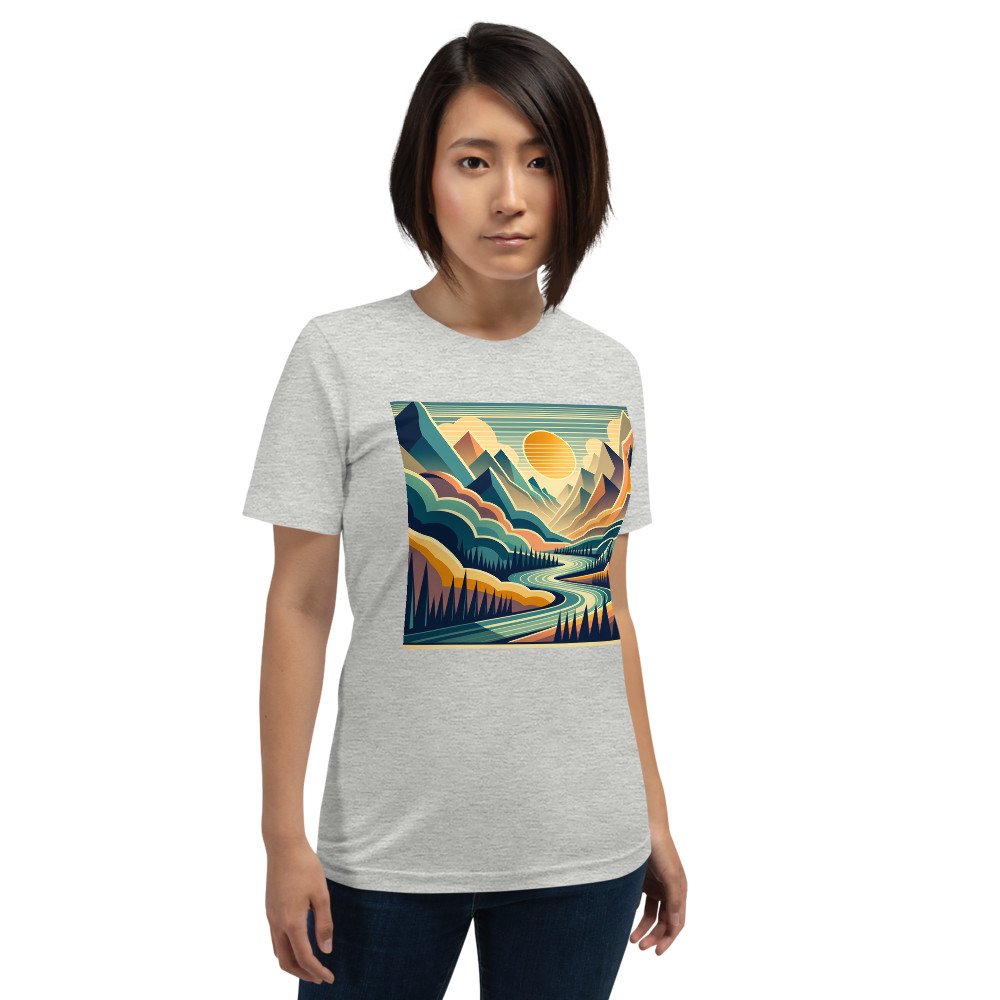 This relaxed-fit cotton tee carries the geometric mountain scene with comfort. Its sharp peaks and glowing stripes in teal and amber offer a crisp, retro aesthetic for everyday wear. The ringspun fabric ensures the detailed landscape remains vibrant.