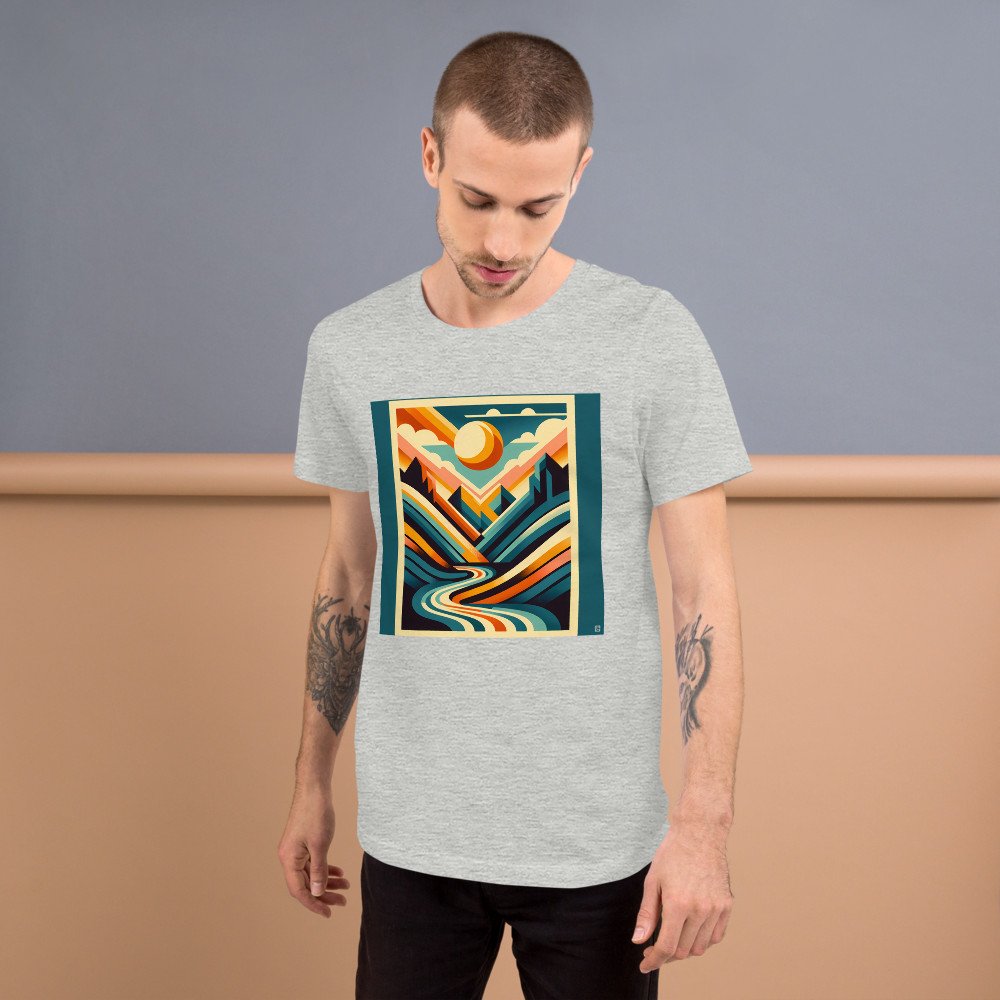 Geometric Mountain Valley with Sun and River — T-Shirt