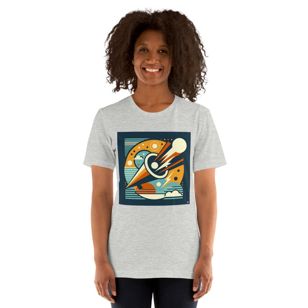 This relaxed-fit cotton tee brings the dynamic geometry to casual wear. The comet's sharp trajectory and warm orange tones stand out against the deep navy base, creating a clean retro-futurist look for everyday style.