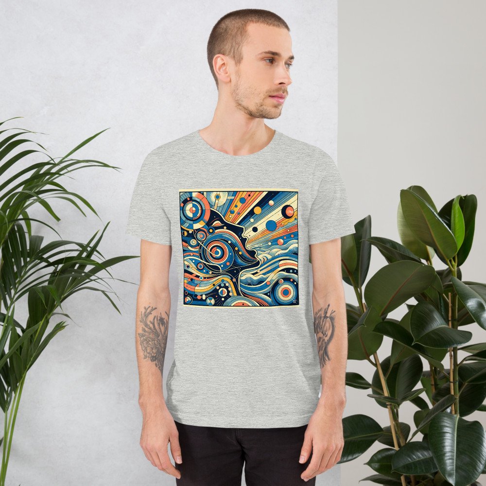 Retro Cosmic Woman Profile with Geometric Orbs — T-Shirt