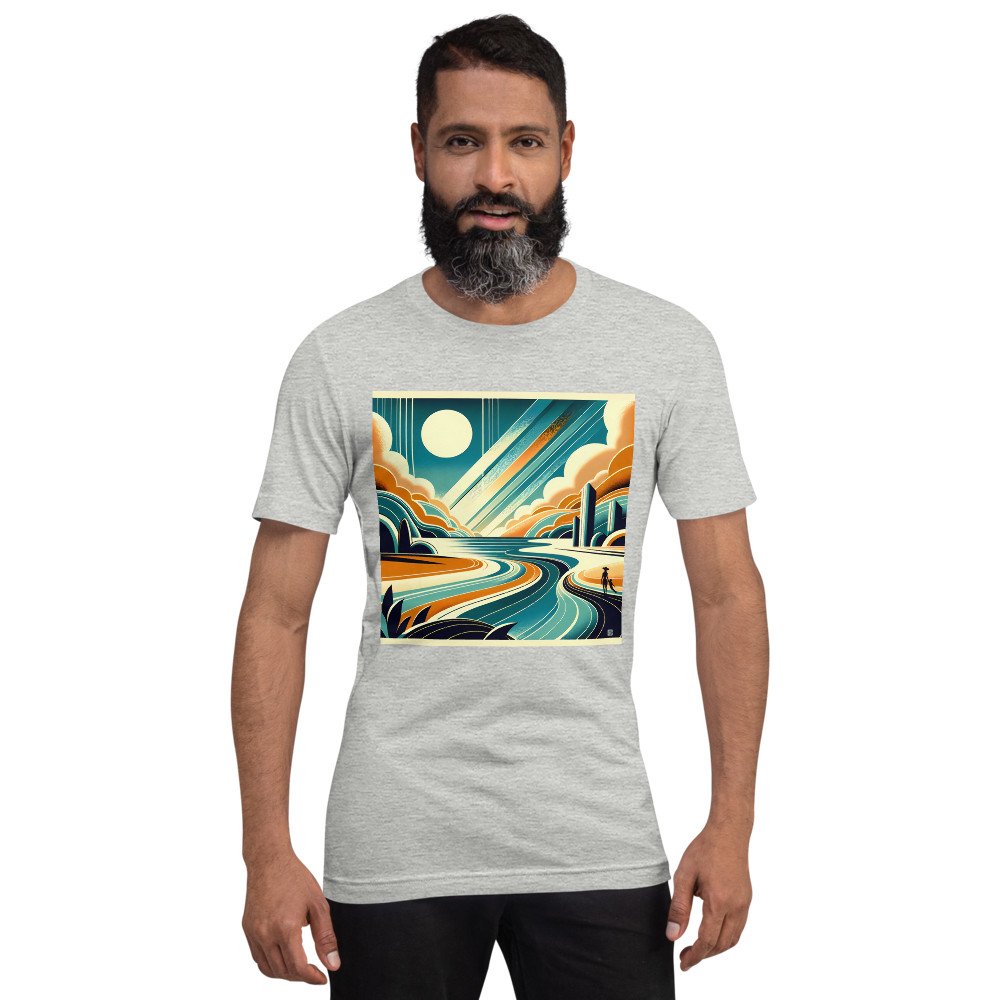 Elysian TidesRetro Coastal Landscape with Sun and Geometric Clouds — T-Shirt