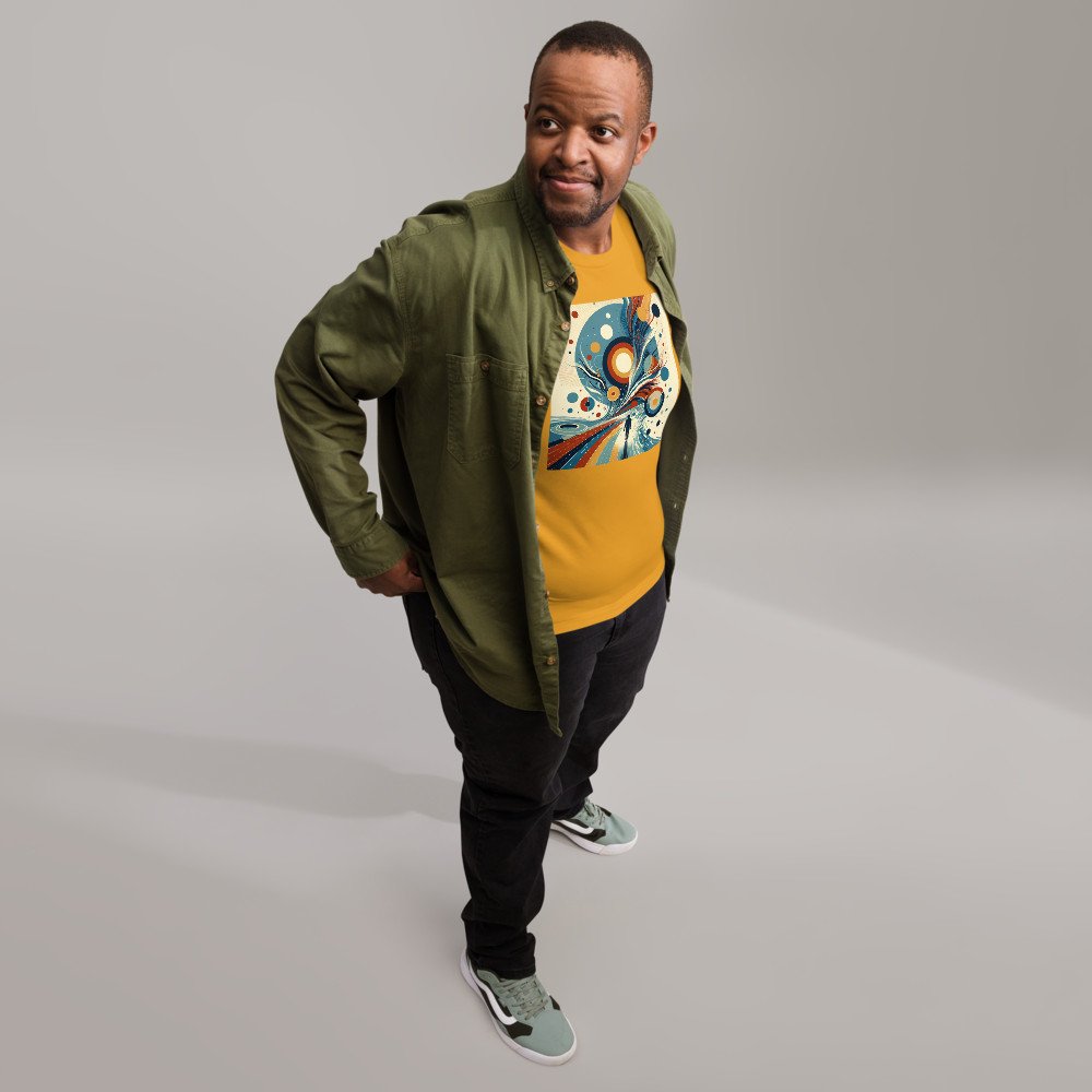 Retro Abstract Cosmic Swirls with Silhouette Figure — T-Shirt