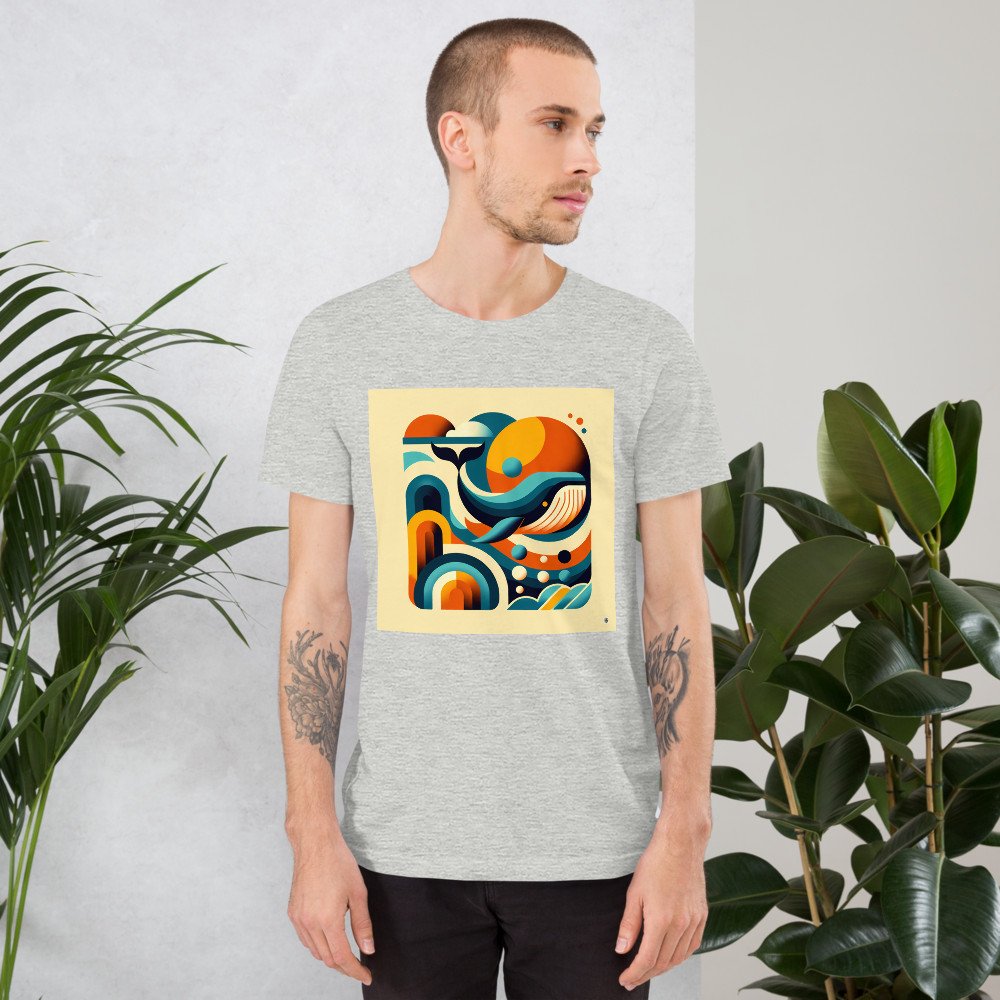 This relaxed-fit cotton tee features the graphic marine scene, where a geometric whale swims through layered teal and orange waves. The soft, ringspun fabric ensures the mid-century modern design remains a comfortable and striking focal point for casual wear.